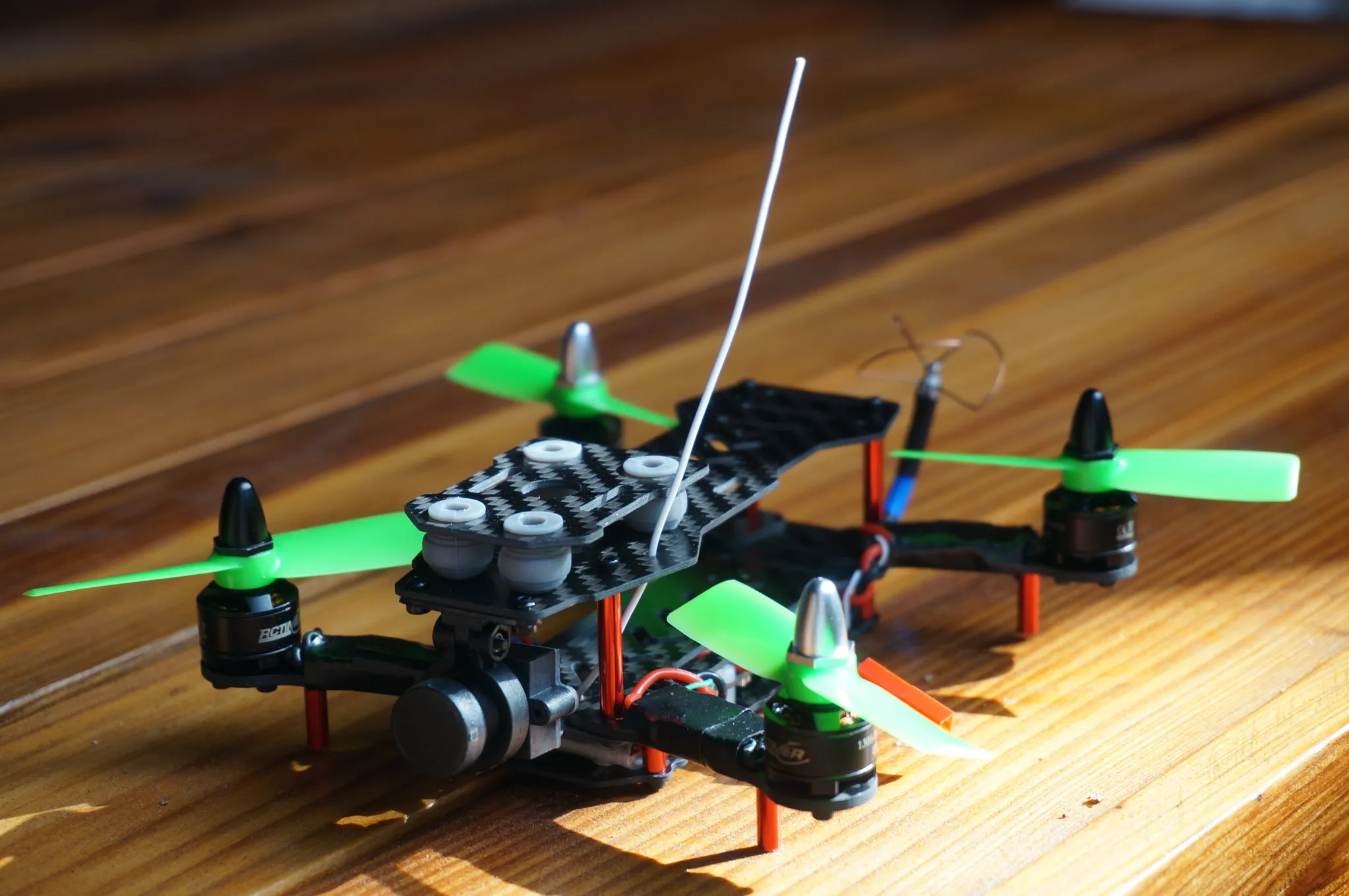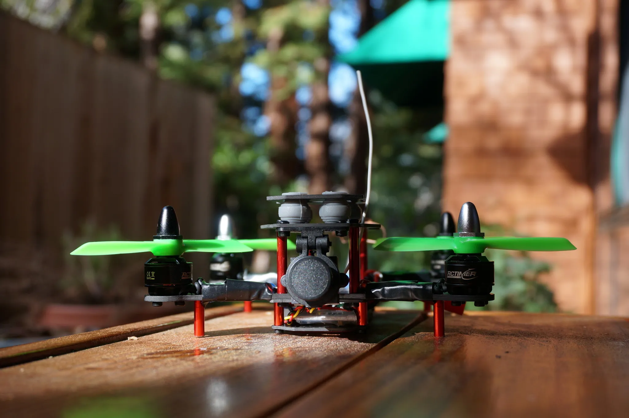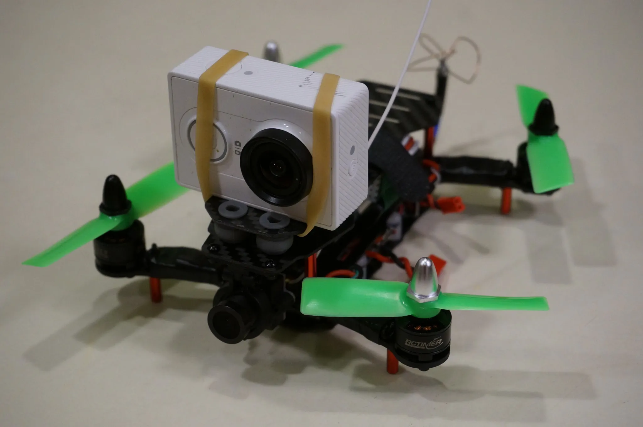 This go-pro clone looks laughably large on this tiny quad. Even with the camera, it hovers at %50 throttle.