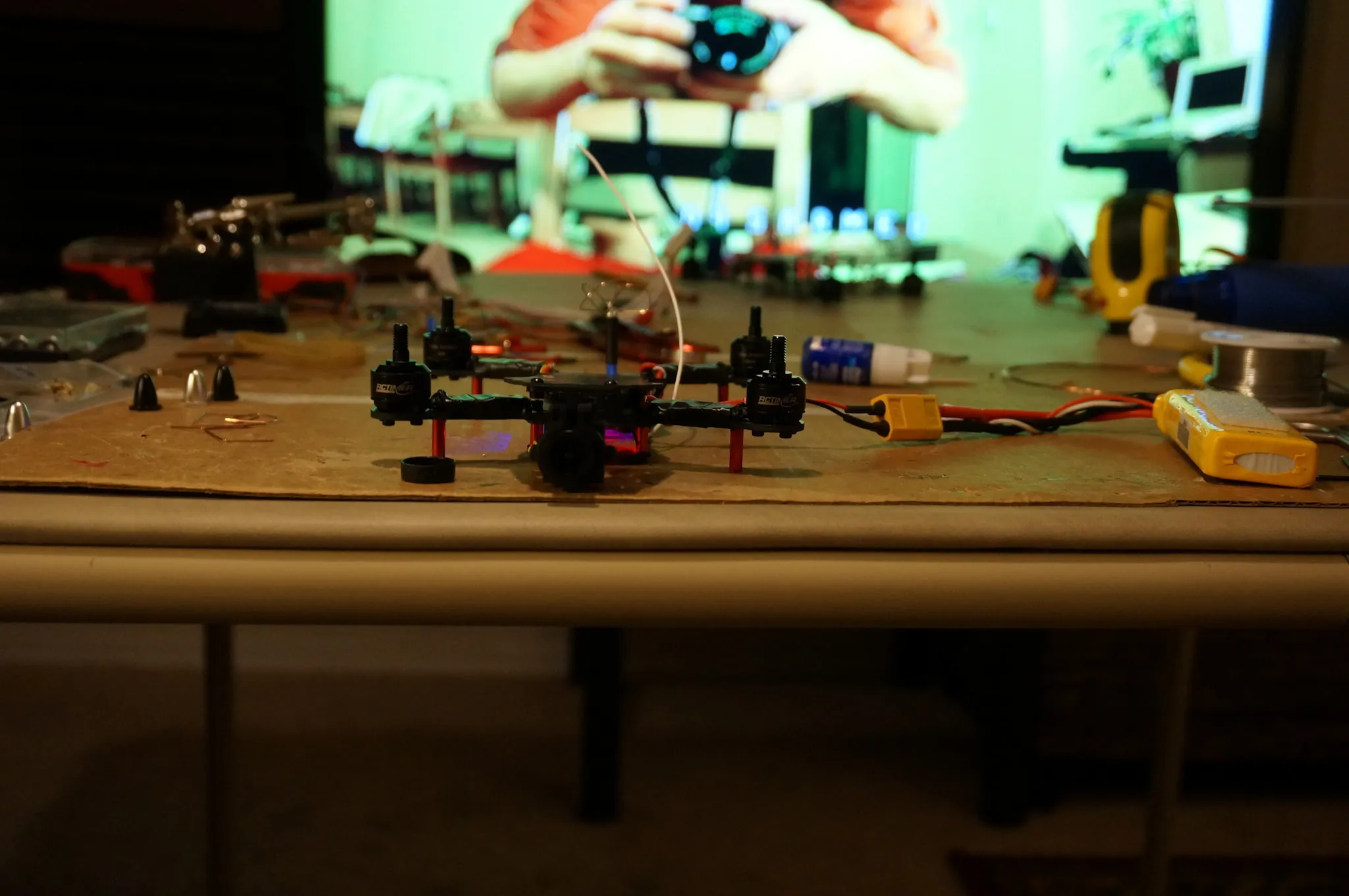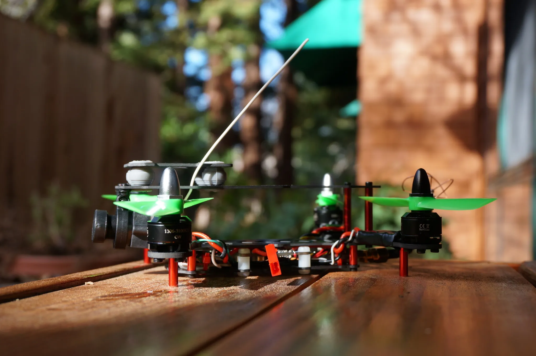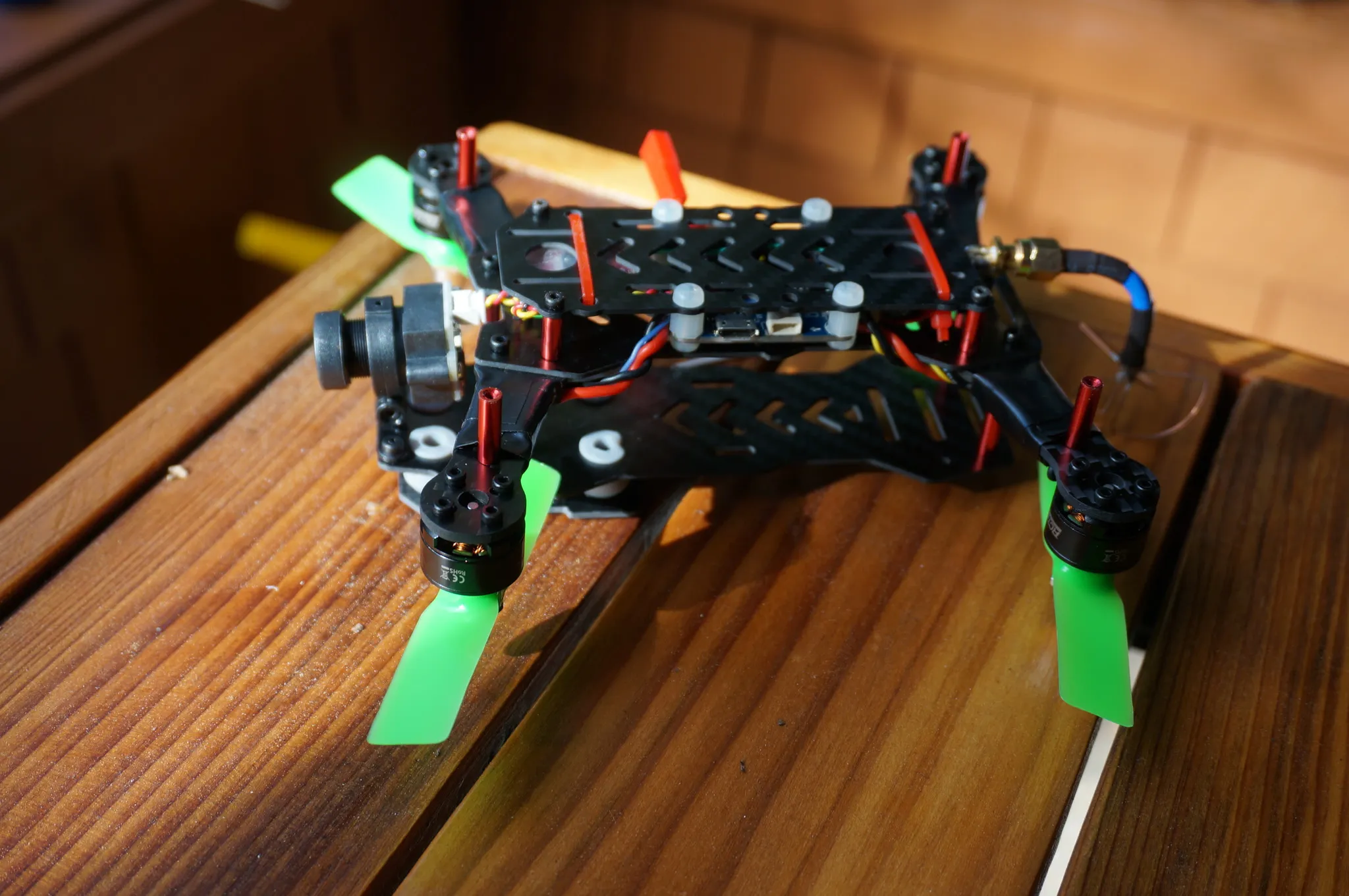 This go-pro clone looks laughably large on this tiny quad. Even with the camera, it hovers at %50 throttle.
