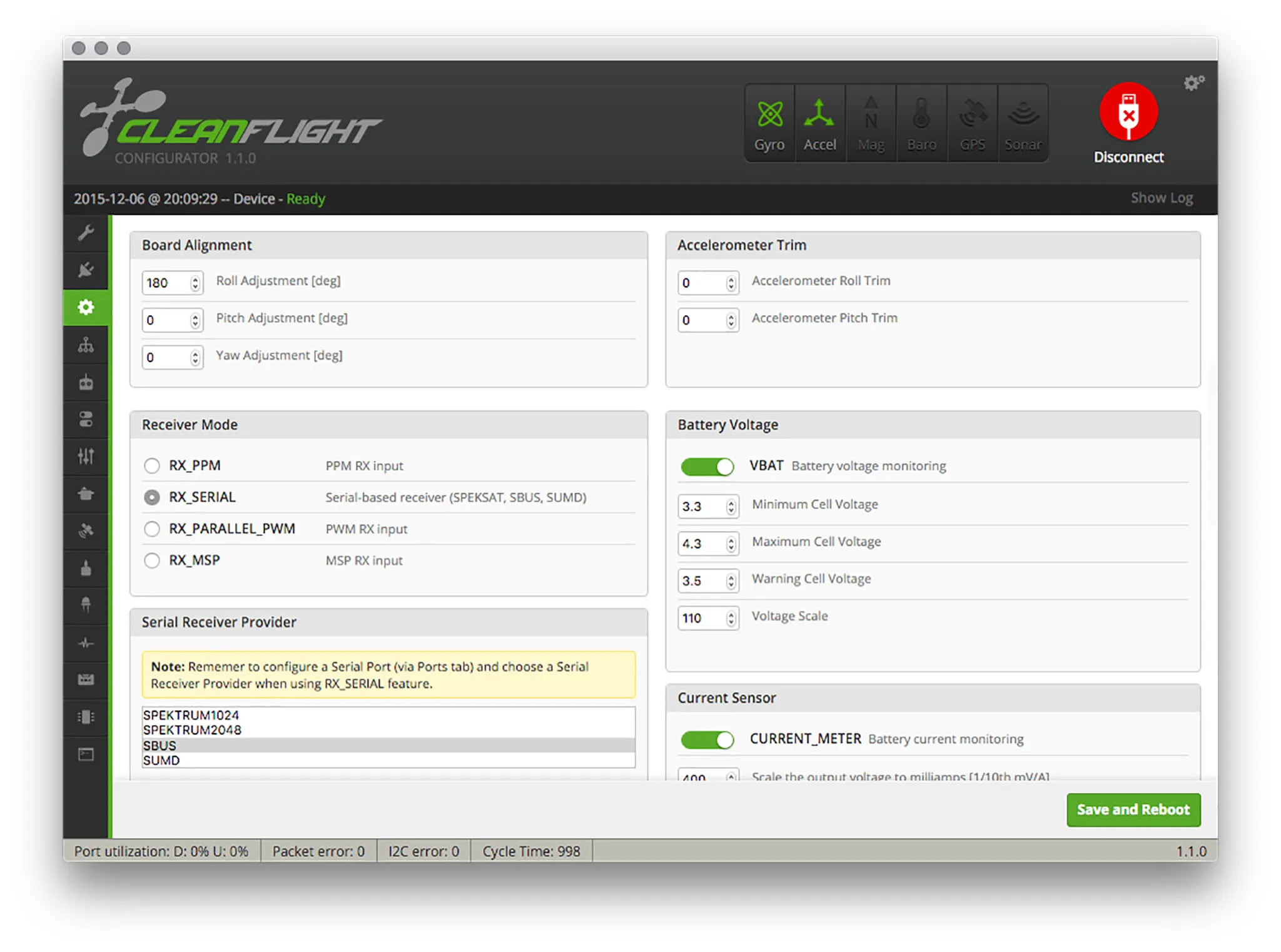 Enable your receiver type, current sensor, and set the orientation if you mounted it upside-down (roll = 180).