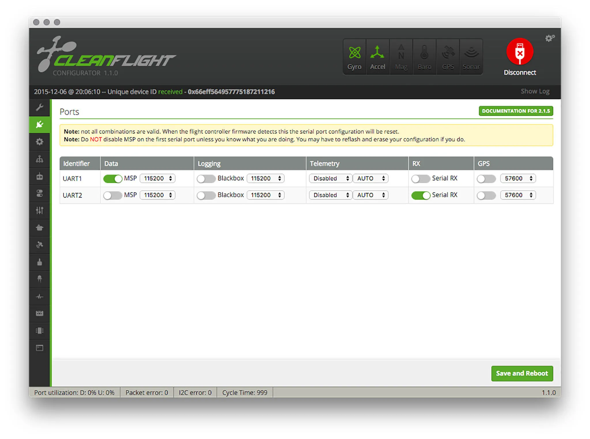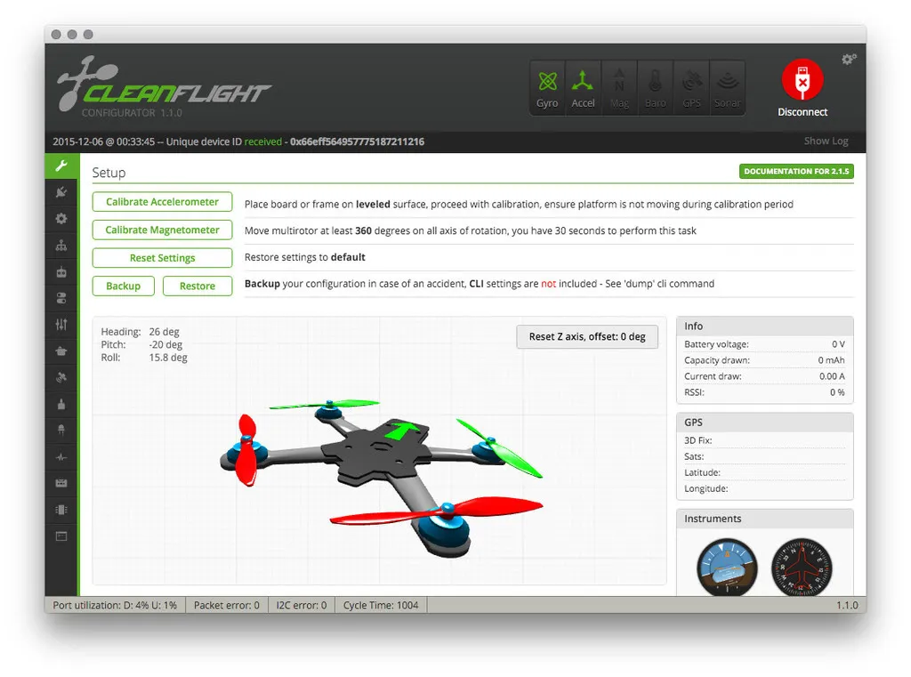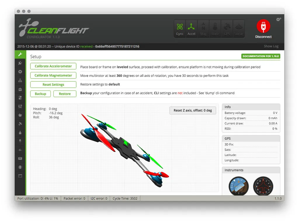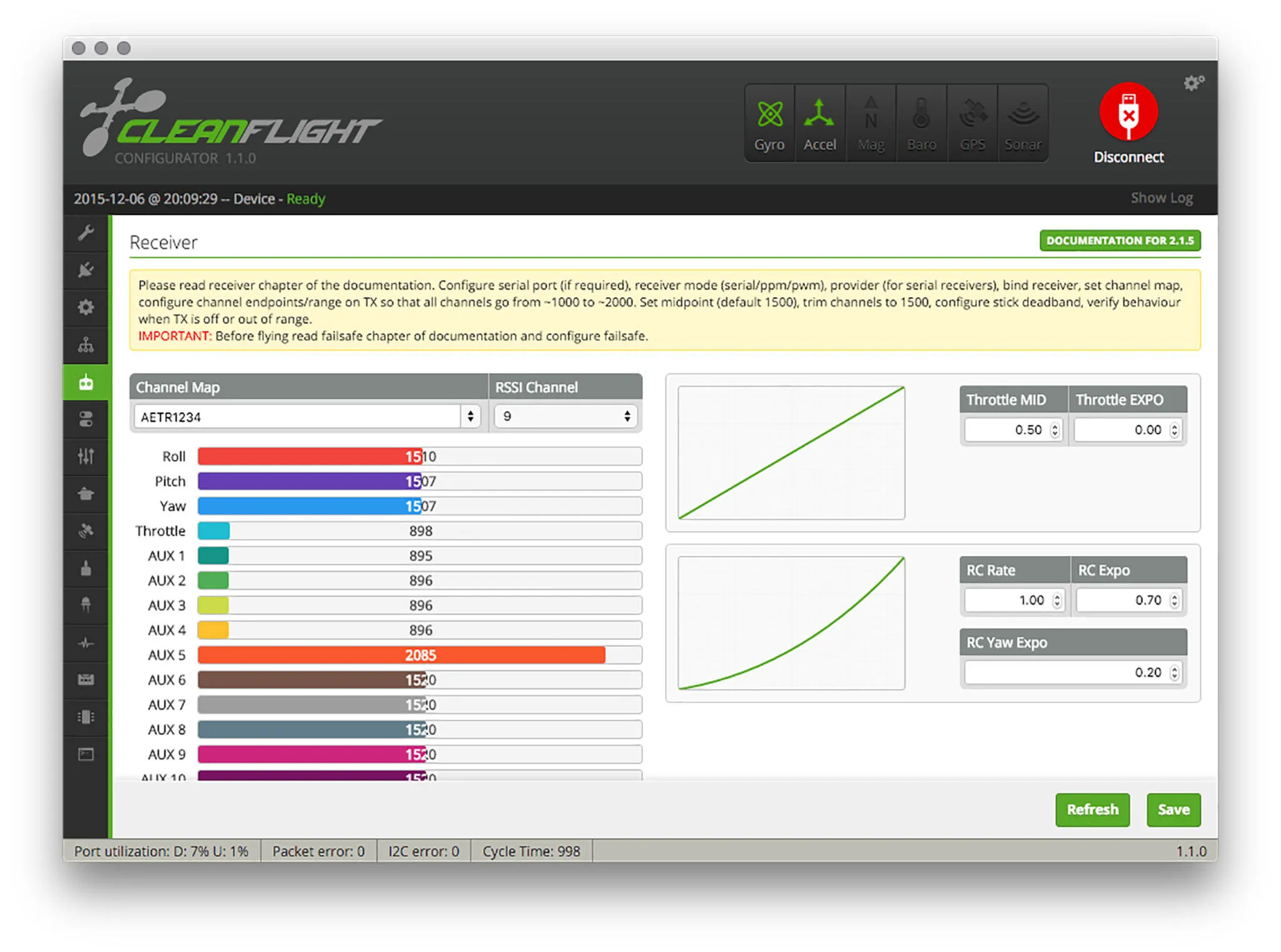 I’ll do a quick test to make sure the receiver is working by plugging the OZE32 into my computer and turning on my transmitter and checking the RX tab in CleanFlight.