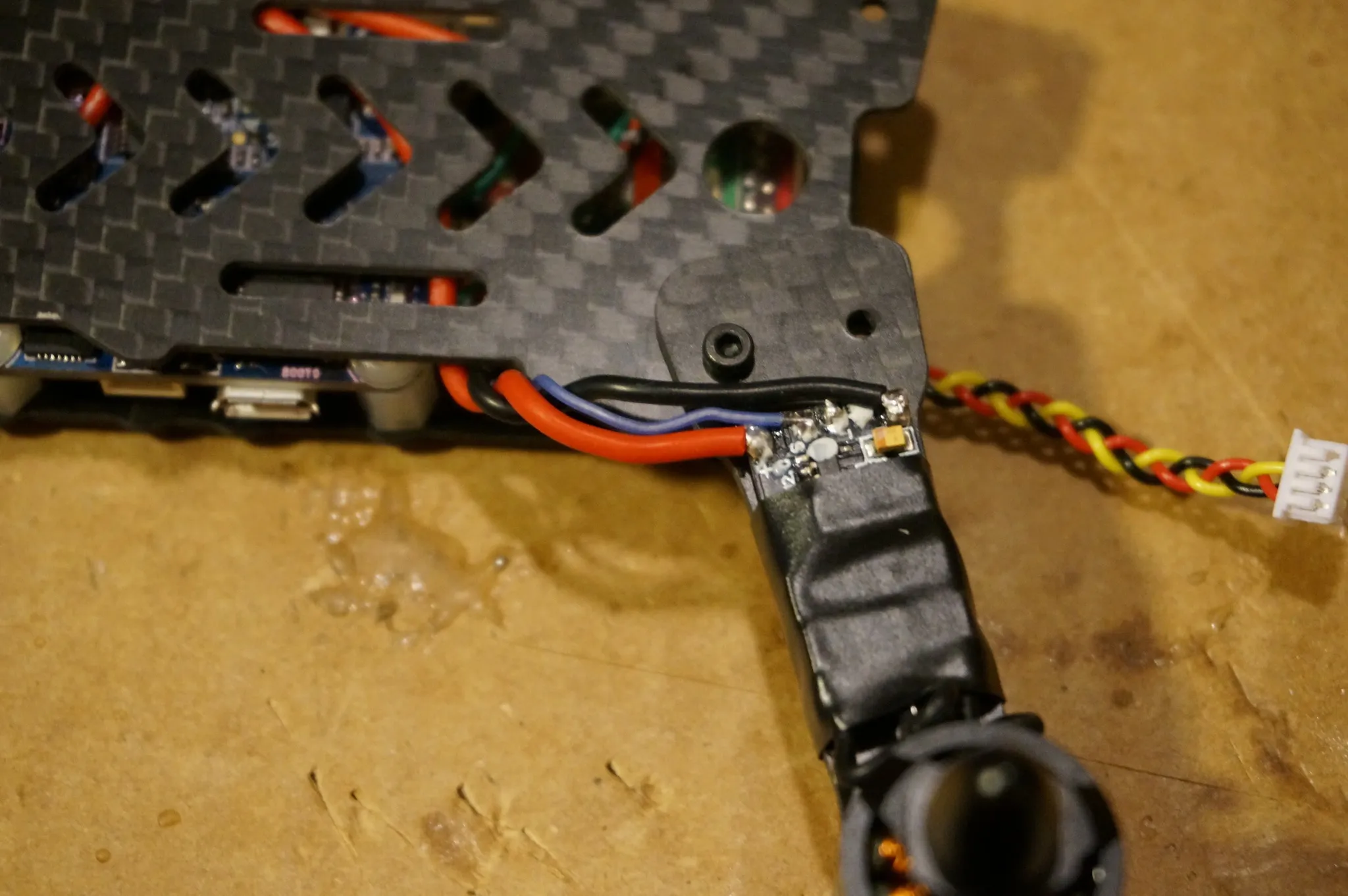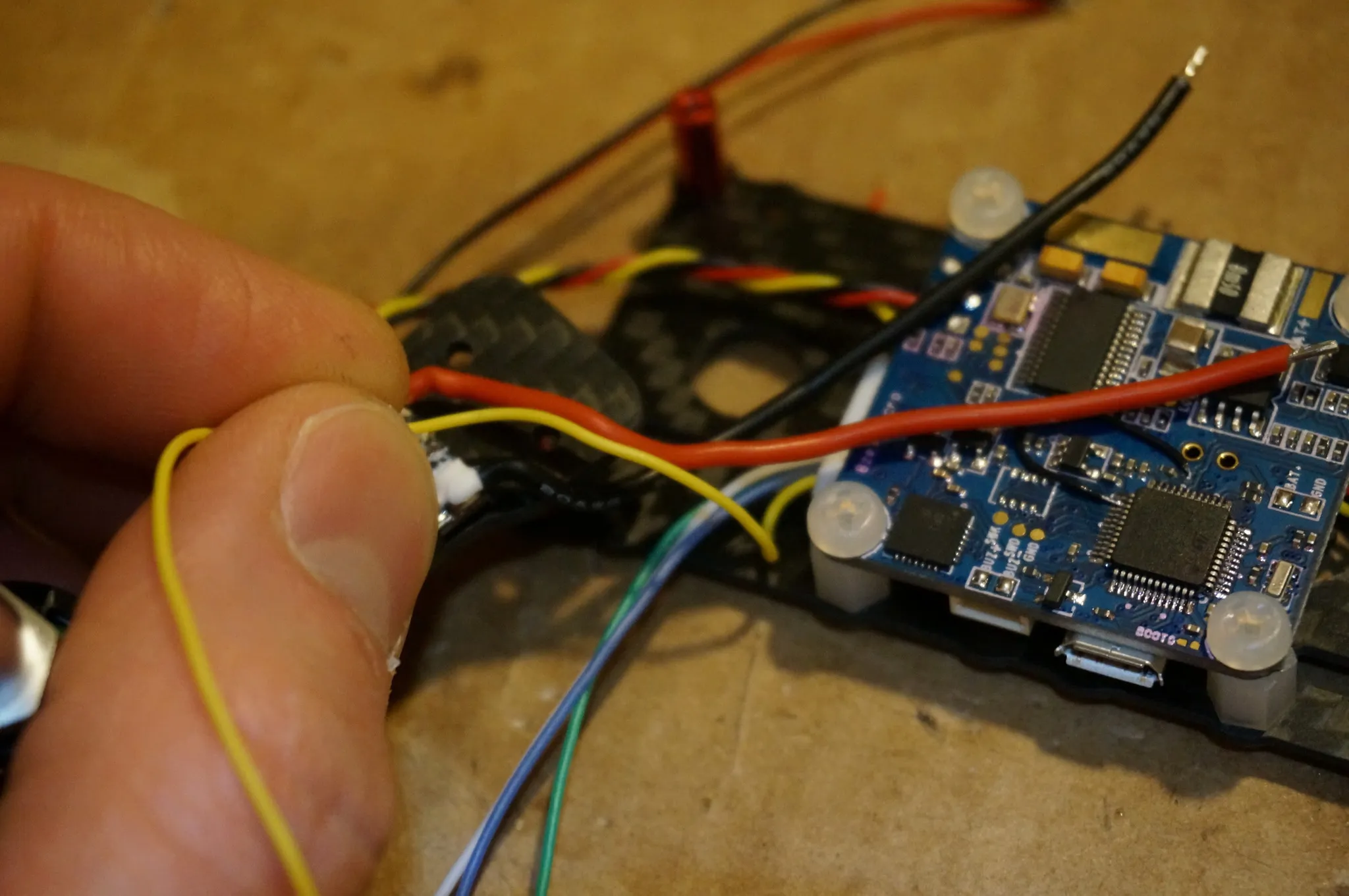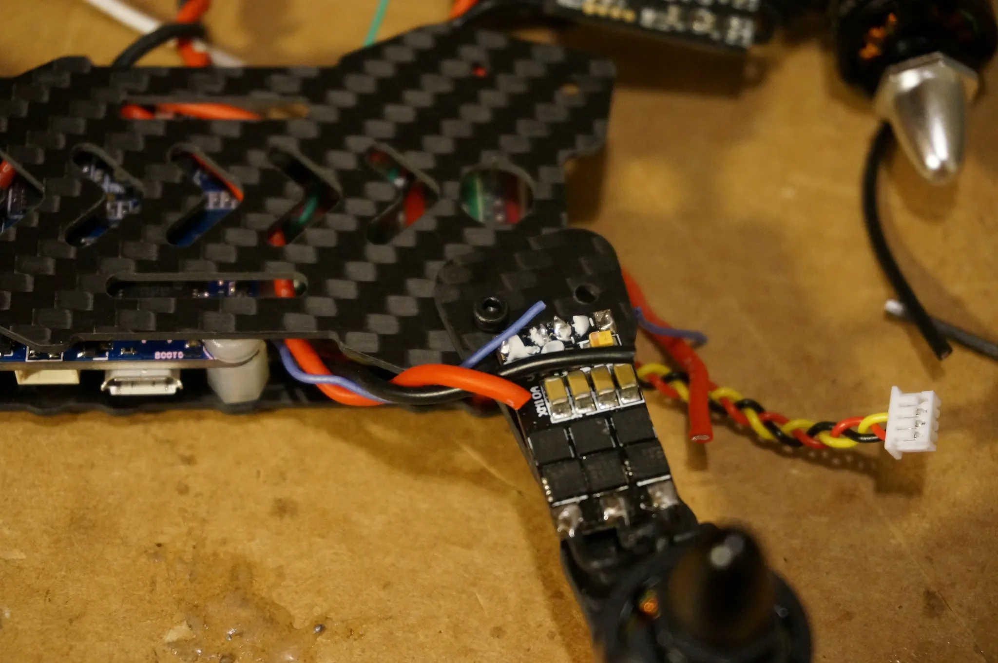 The front left ESC needed longer power wires, so I removed these and soldered on longer ones.