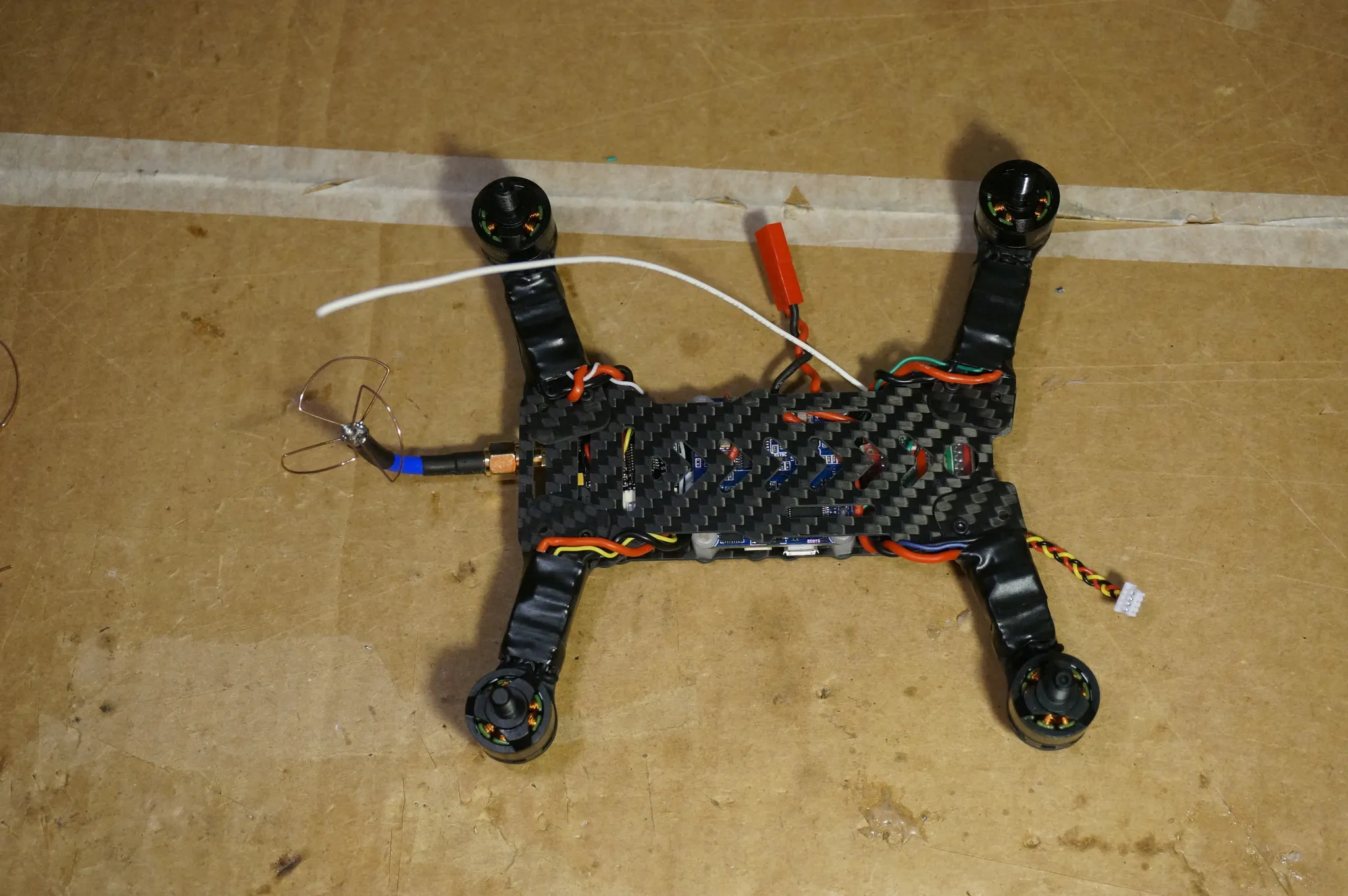 Remember that carbon fiber is conductive, so make sure you put some electrical tape or shrink wrap on anything touching the frame. I removed the sticker from the VTX and put a piece of electrical tape over the ground cage.