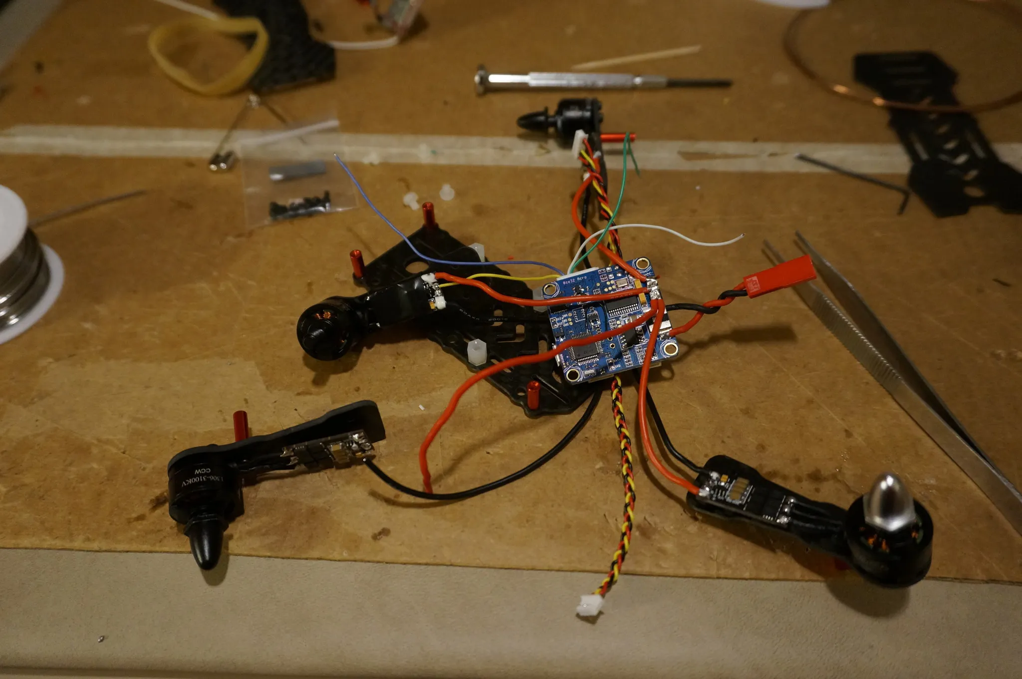 In hindsight the ESC with re-soldered power leads looked the cleanest and was the easiest to work with. I might consider un-soldering all the power leads next time, mounting the arms, then soldering them back on the right direction next time.