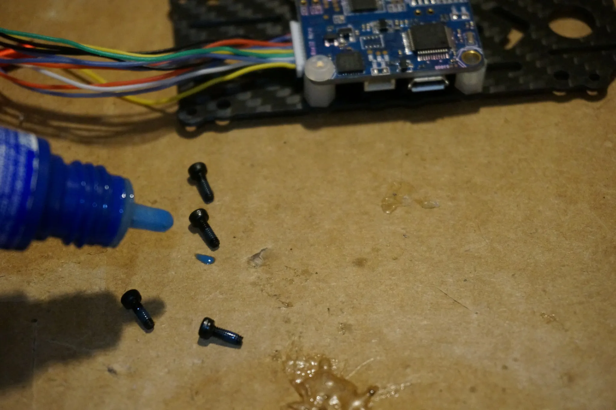 Attach the standoffs. Put thread lock on all the metal screws. Don’t use it on nylon bolts or nylock nuts, as it will corrode the plastic.