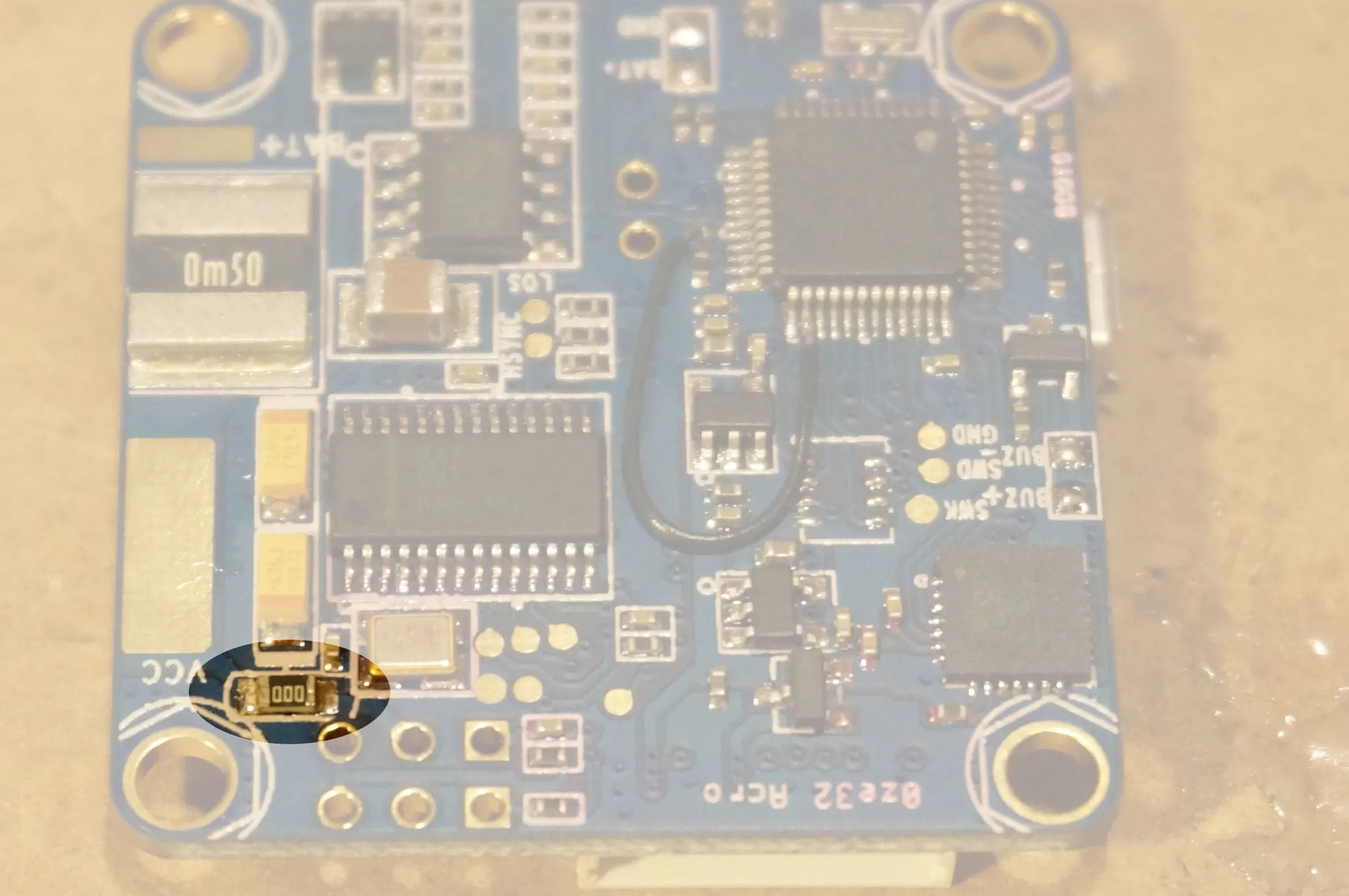 I don’t like soldering wires directly to other wires as these connections tend to break, so instead of cutting down the VTX to Camera V+ and GND wire and soldering them together, I removed this resistor on the OZE32, which disconnects the 12v pins on the video headers from the OZE32, but leaves both 12v pins connected together, and soldered both sides to the board. This just allows the power and ground to pass through OZE32, without making any connections to it.