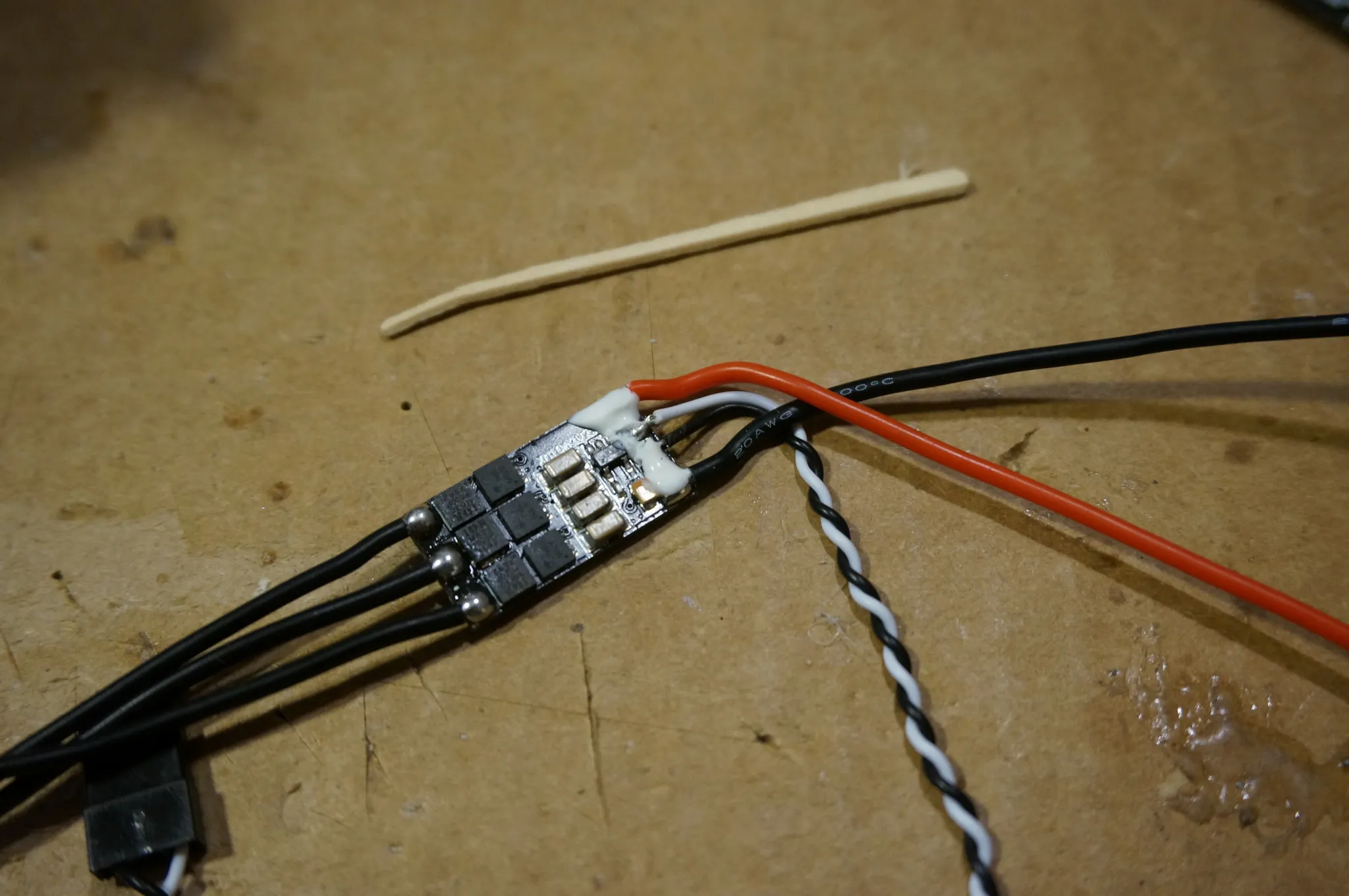 Scrape away the white silicone with a toothpick to expose the servo solder points. Don’t use a metal instrument if you value your ESC, as it would be easy to damage the coating on the board with a metal instrument.