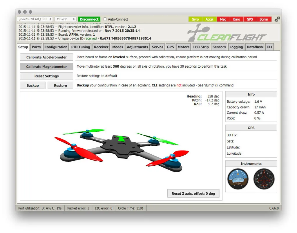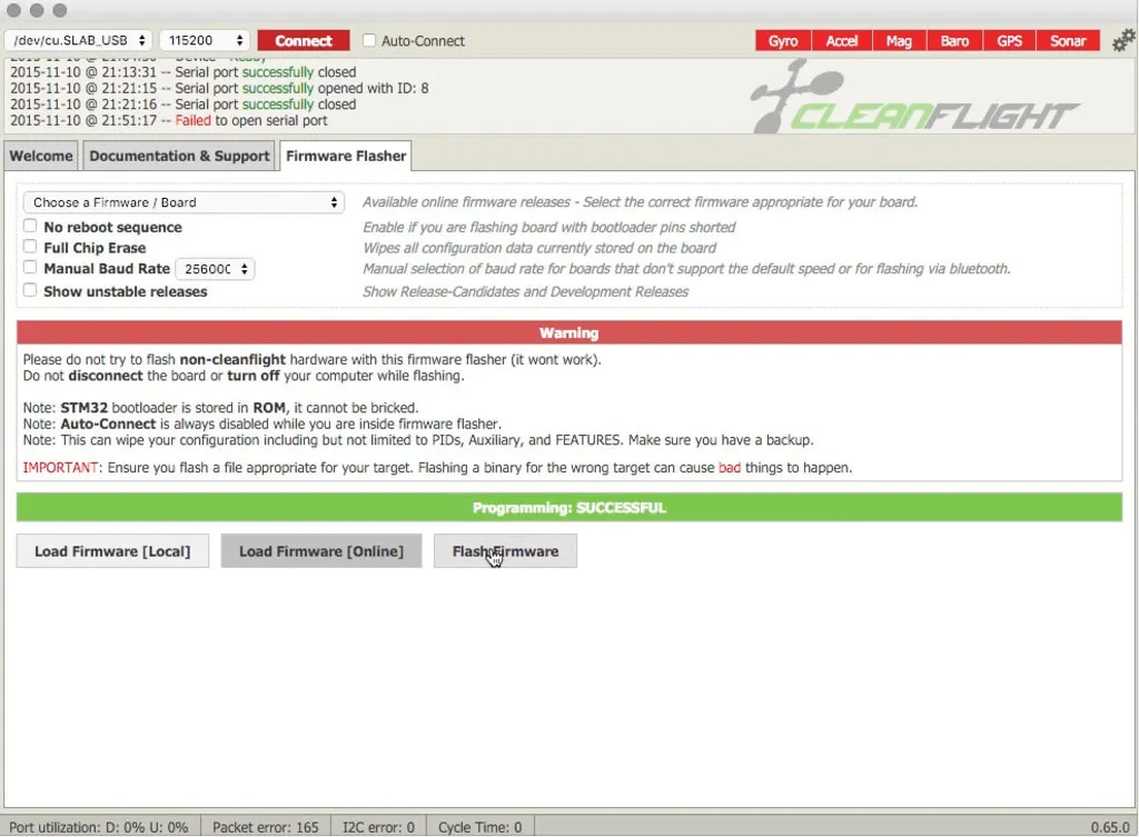 First, I just got an update from Paul at Ready To Fly Quads that they’re shipping the OZE32 with CleanFlight 1.10.0 and ScarabOSD with all the right flags set. So feel free to fly this stock. For those that want BetaFlight (you should want it, it’s awesome) or like to live on the bleeding edge (myself included), read on and flash away!