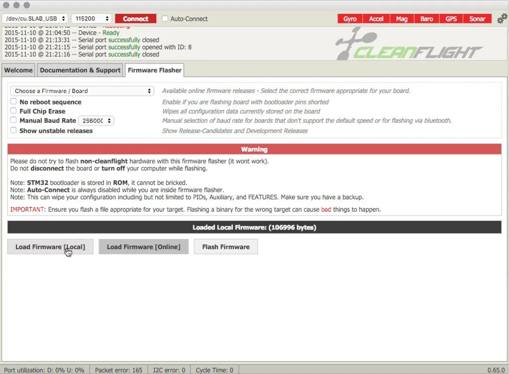 Click Load Local and pick the Naze32 hex file you downloaded.