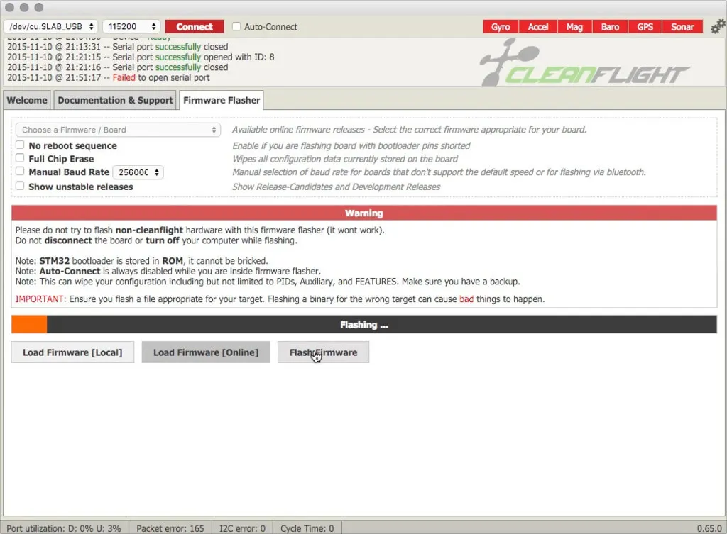 Open the CleanFlight configuration tool from Google Chrome and switch to the Firmware Flasher tab.