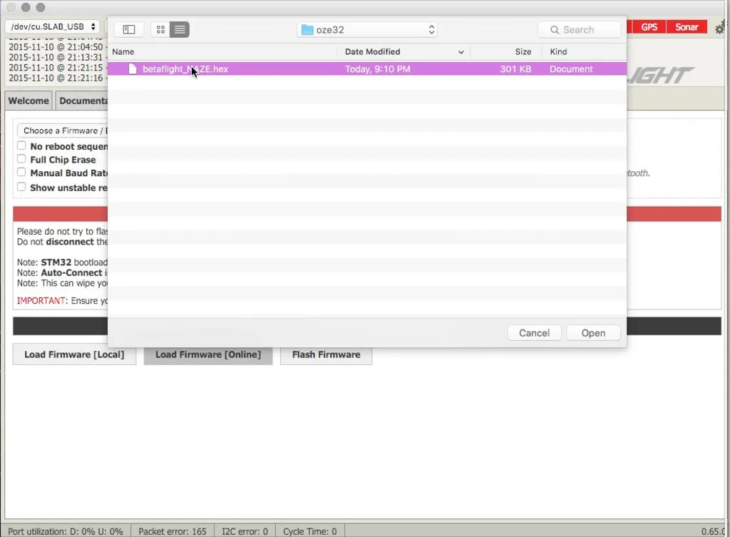 Let’s flash the FC with BetaFlight first. The same applies if you want to use CleanFlight, just use the appropriate hex file.