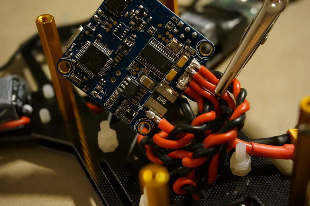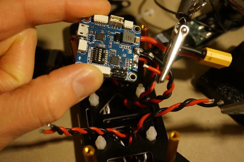 I started by soldering a little red JST connector to the large VCC and GND pads. I haven’t soldered it on in this picture yet, but the XT-60 for the battery will be