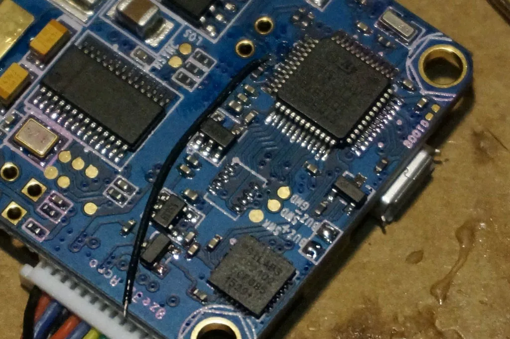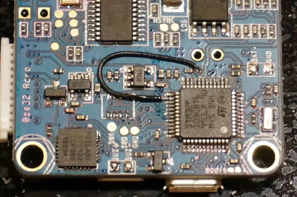 Update (Feb 2016): The BetaFlight code has changed such that the loop time will be at or near 1000 even if the IMU pin is not connected. This reduces the impact of aliases when gyro sync is not available. This means that connecting the IMU pin no longer makes a significant performance difference. Since I have fried a chip connecting the IMU pin, I suggest you skip this step as the risk is not worth the payoff. Jump to the section on ESCs.