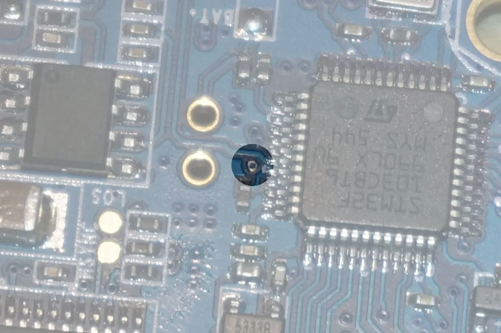 Remove the solder mask from the IMU interrupt pin via. I used the tip of a pin: