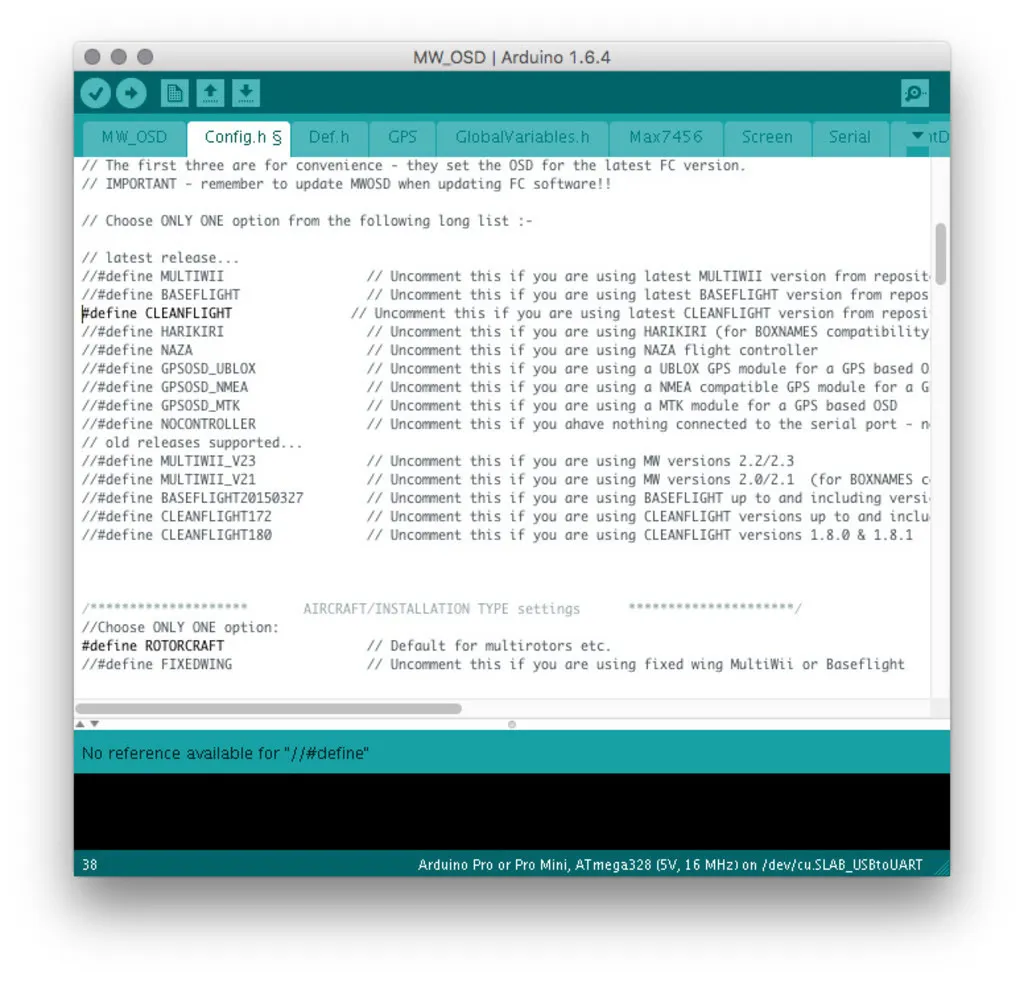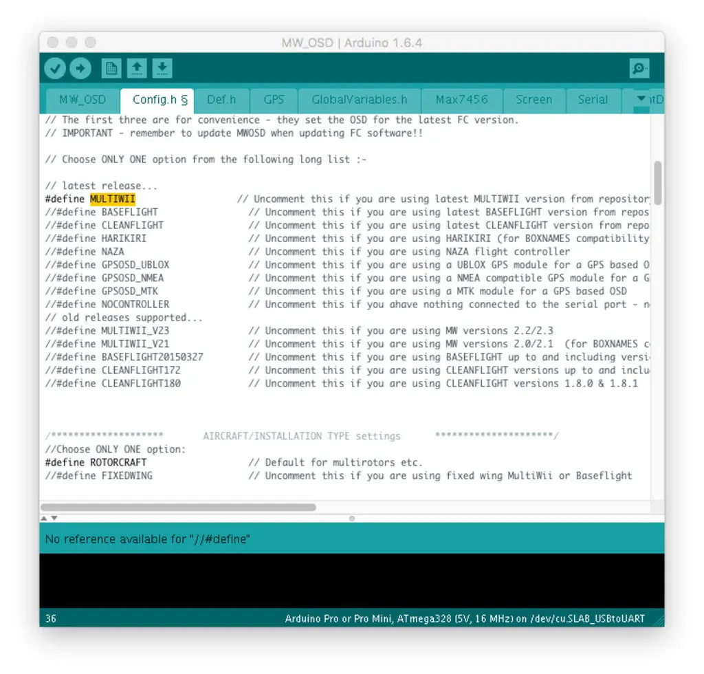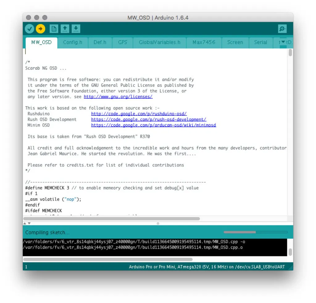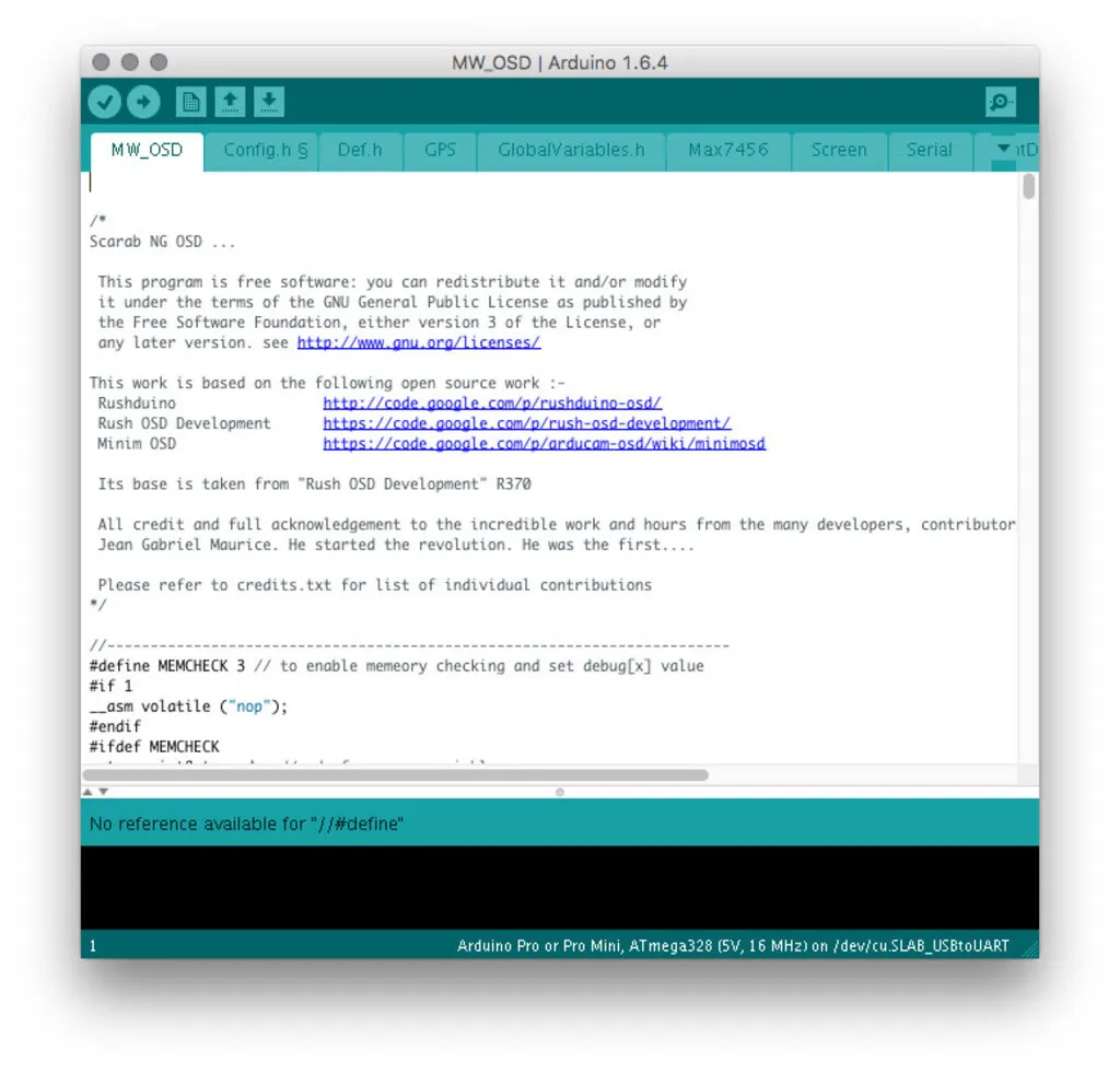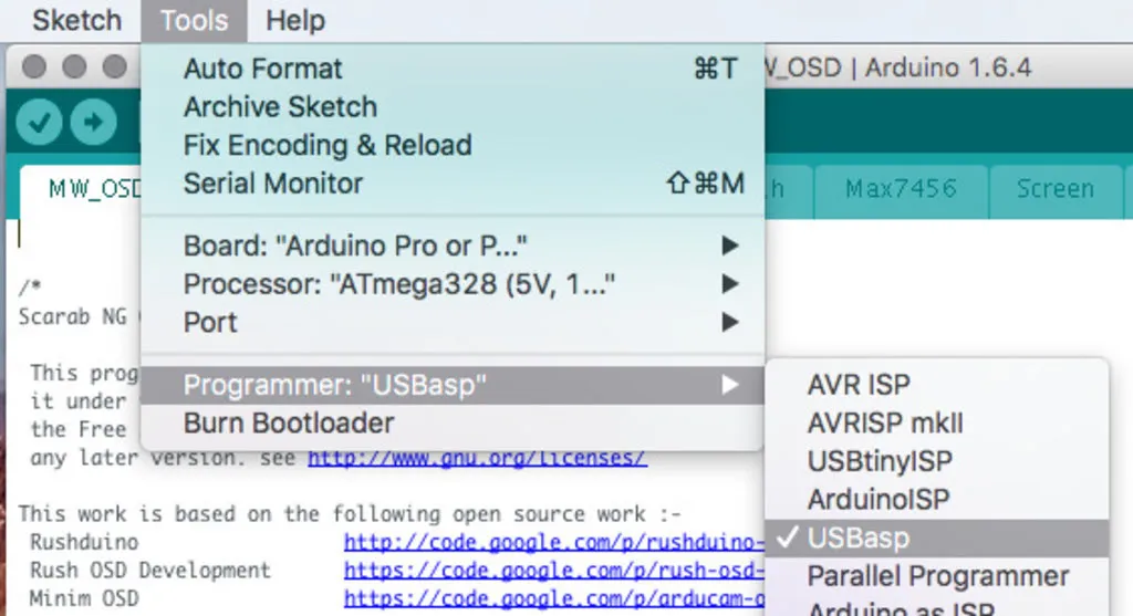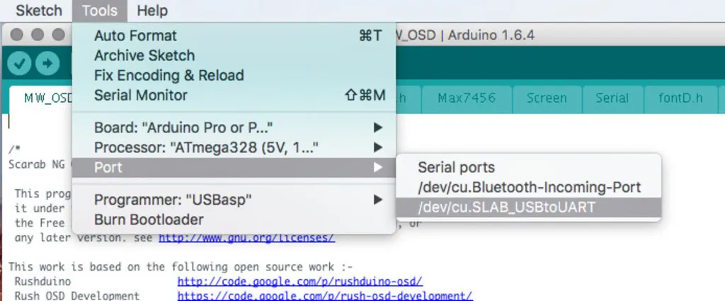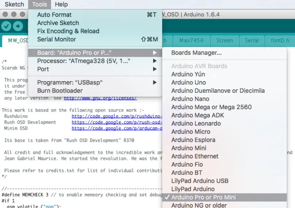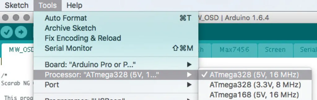 Open Arduino, download it first, if you don’t already have it. From Arduino, open the MW_OSD folder in the extracted Scarab OSD source and from that folder open MW_OSD.ino.