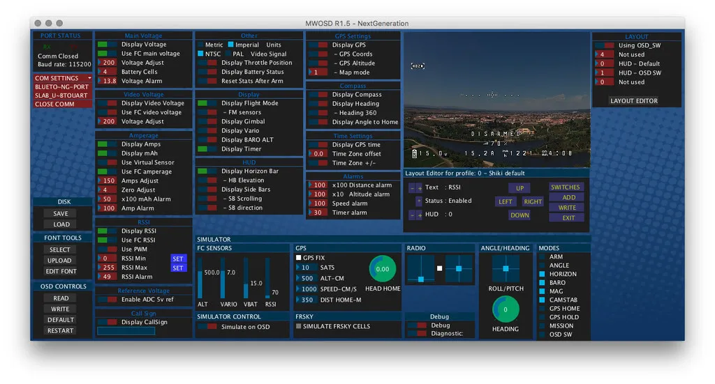 You should see the preview window on the right populate and you can configure your settings. You’ll probably want to turn on Voltage and Amperage settings like so, the number don’t matter, just the switches. This should configure the OSD to display the voltage and amperage from the flight controller.