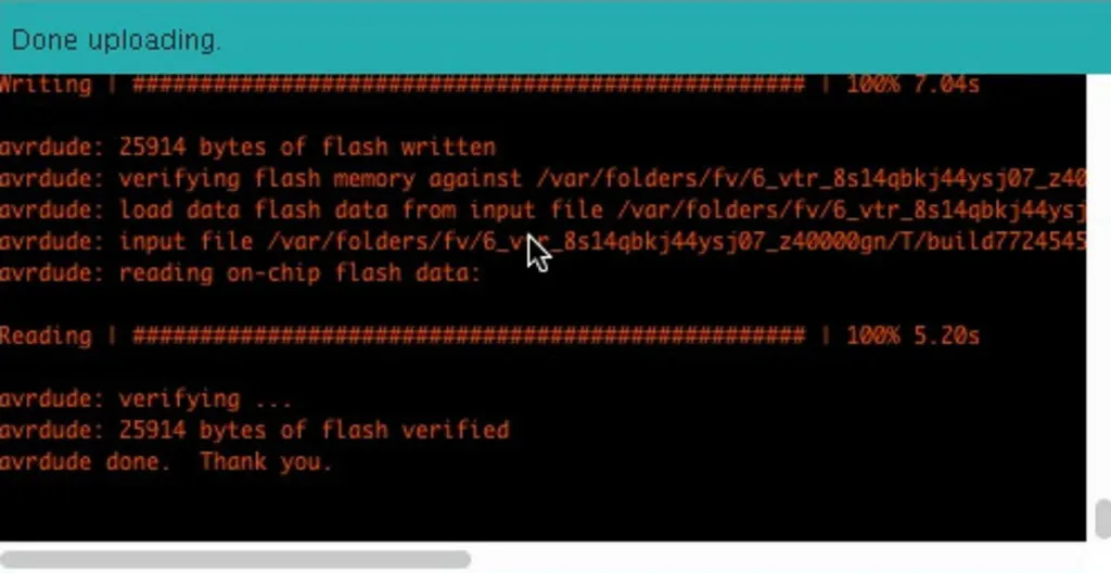 The bottom of the Arduino window will look something like this when it completes: