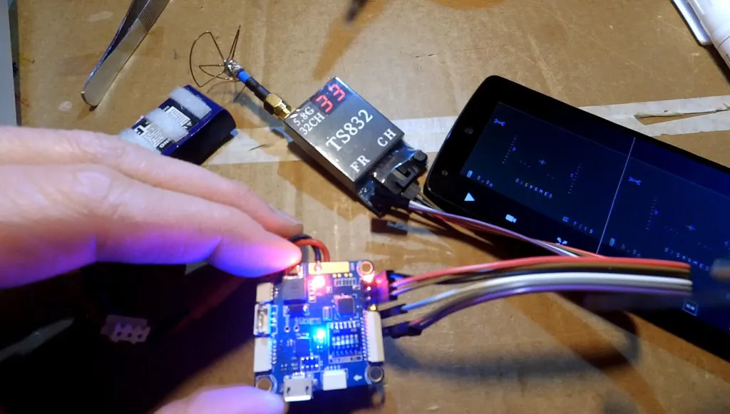 Plug in a battery, be careful if you have plugged in the middle “12v” pin on the video header. Be sure your vtx can handle the full battery voltage. I’m using a 2s, so I’m safe. Plus, my vtx can take up to 18 volts or so.