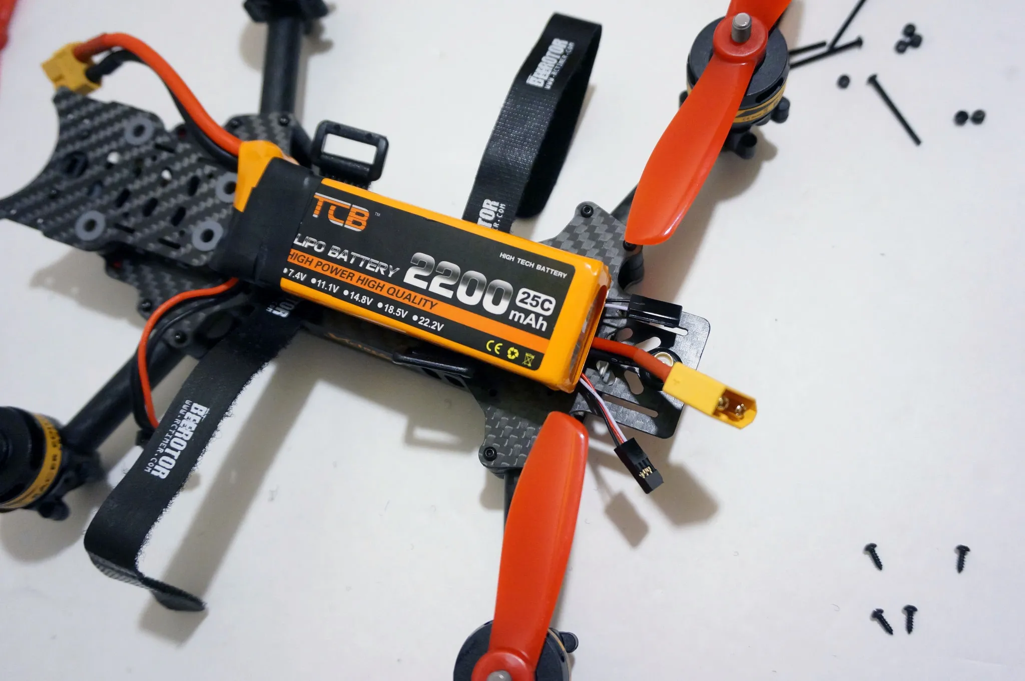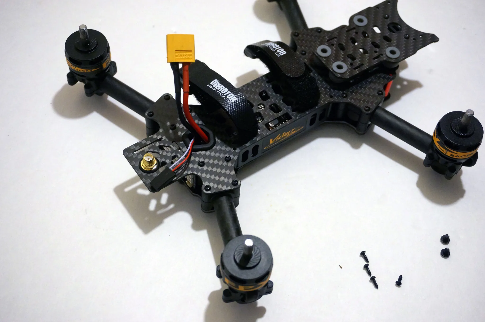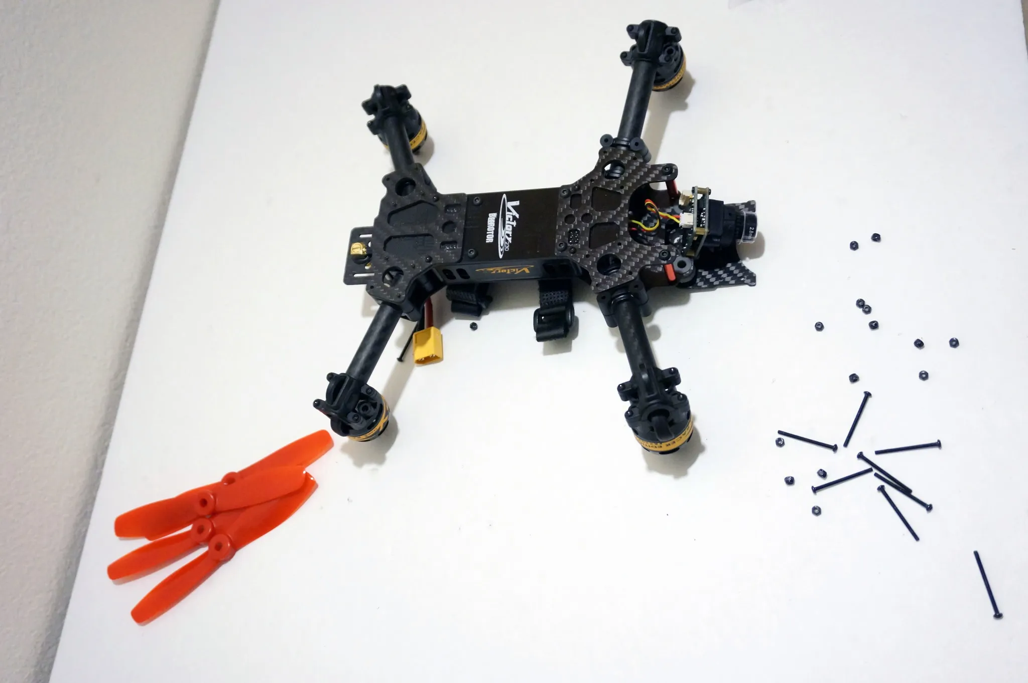 While you’re ordering, it’s pry smart to pick up some extra prop nuts (it only comes with 4) and props. Also, after disassembling my Victory230, it seems like the other likely parts to break or be lost in a hard crash are the bolts holding on the arms. From my measurements they’re M2x22mm.