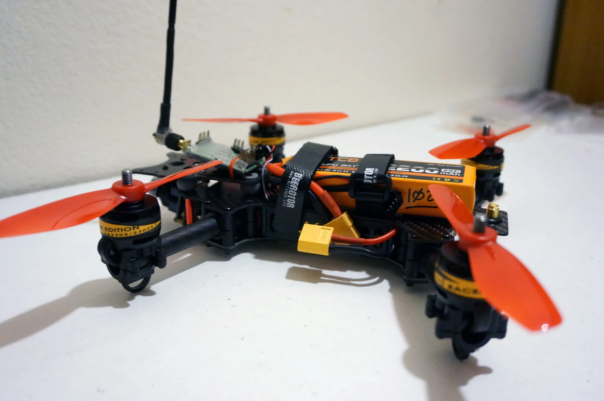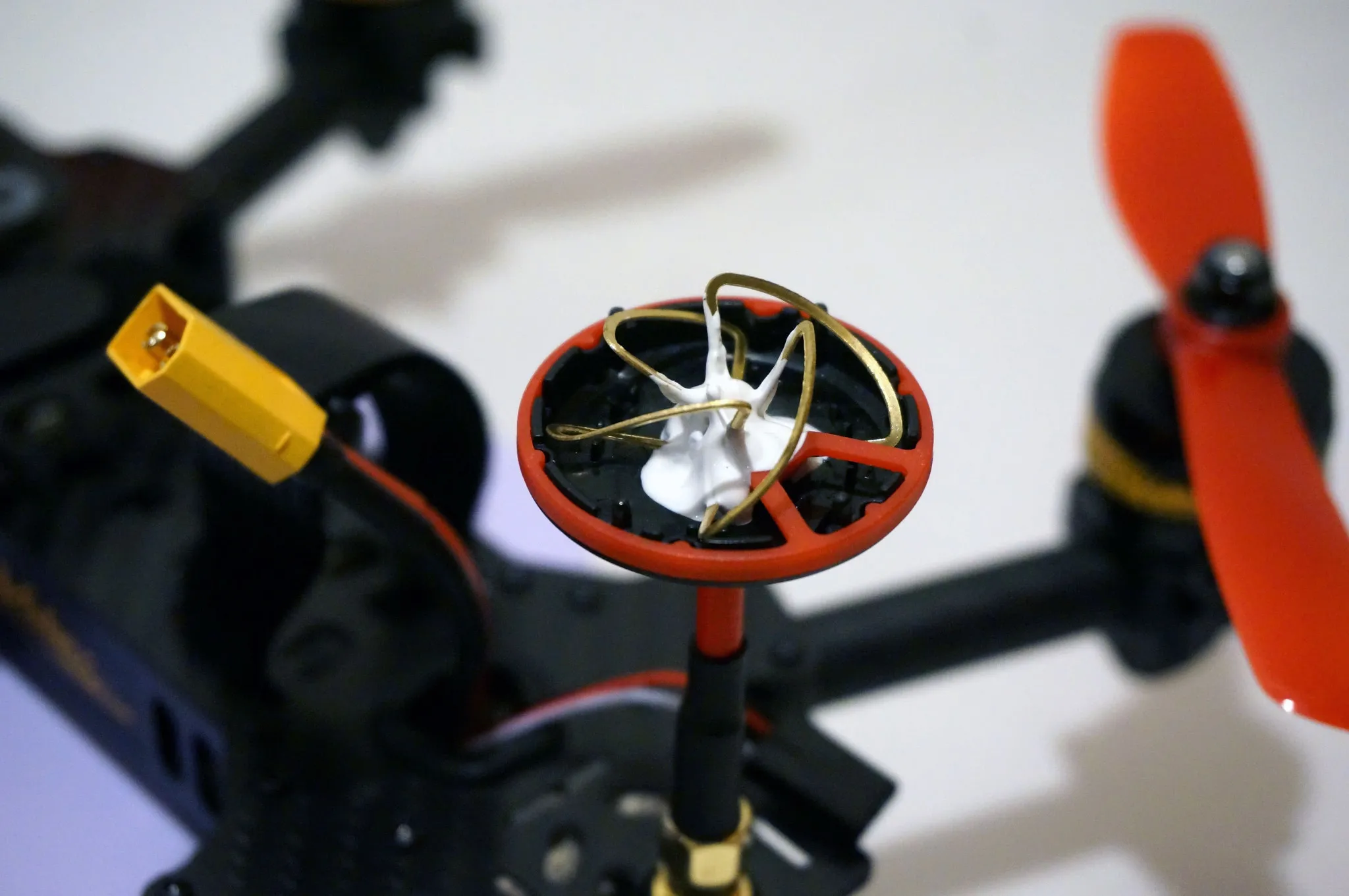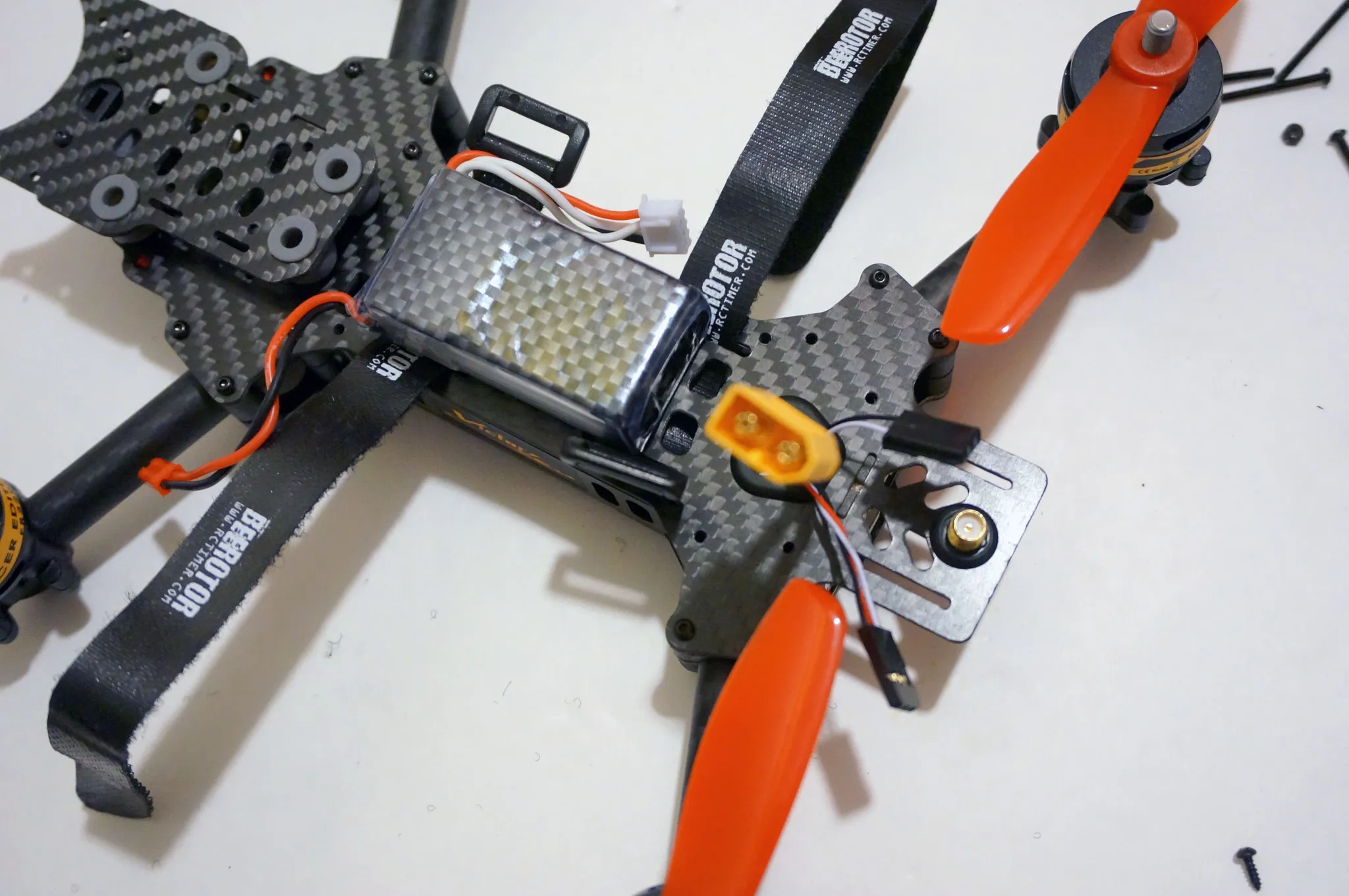 I re-routed it up to the front. I can’t say that I’ve had a vibration damped receiver before. I also re-routed the power connector out the side, so my 2200mah battery fits better on top.