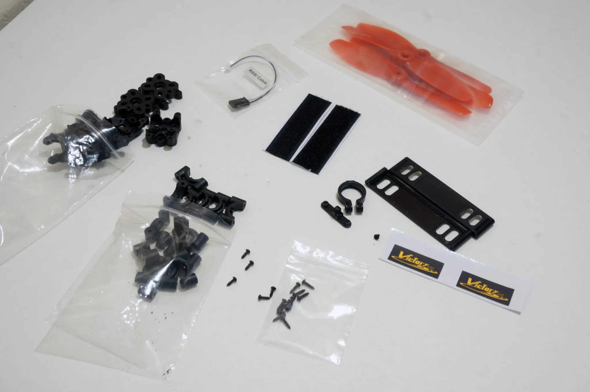 Wow, no messin’ around. It comes with replacement plastic parts to rebuild the entire thing once over, even an extra camera mount, screws and side plates. You also get a RSSI cable, sticky-backed velcro for your battery and an extra set of props.
