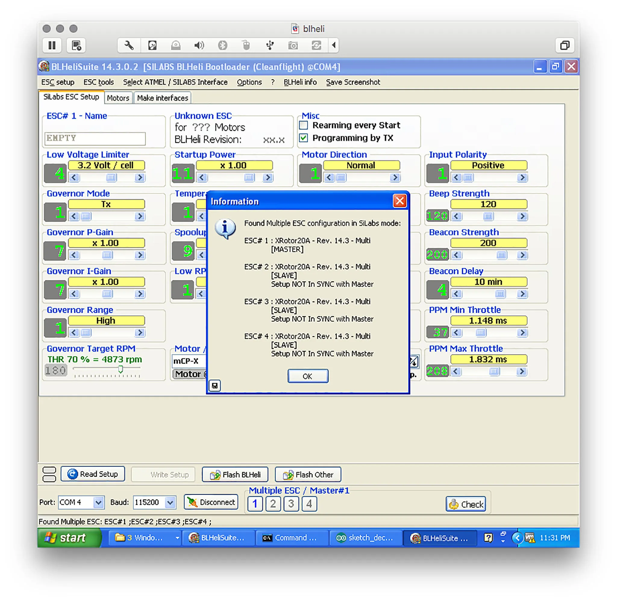 The X-rotor 20A ESCs are pre-flashed with the BlHeli bootloader, so if you ever need to change any settings, you can use the CleanFlight passthrough programmer in BlHeli.