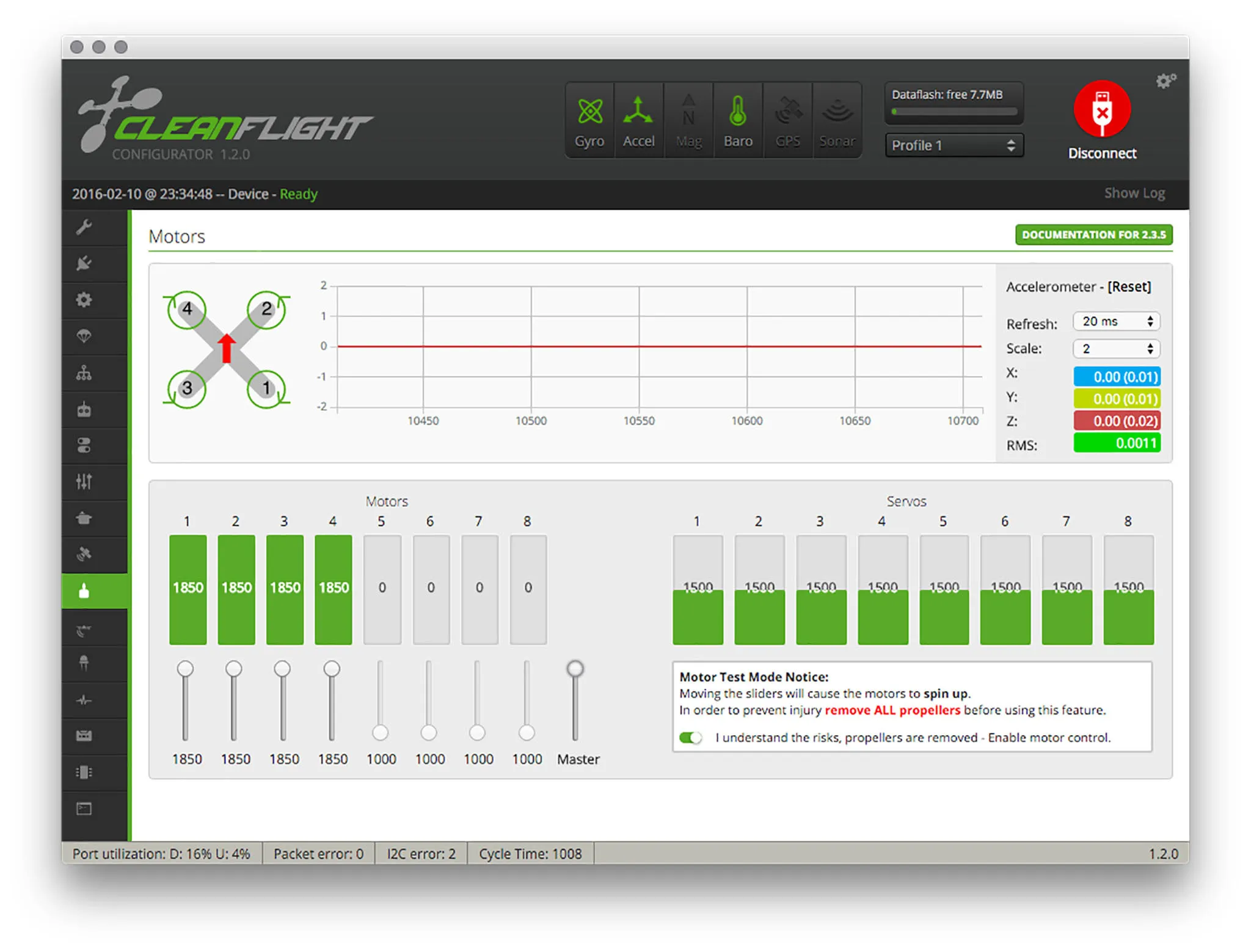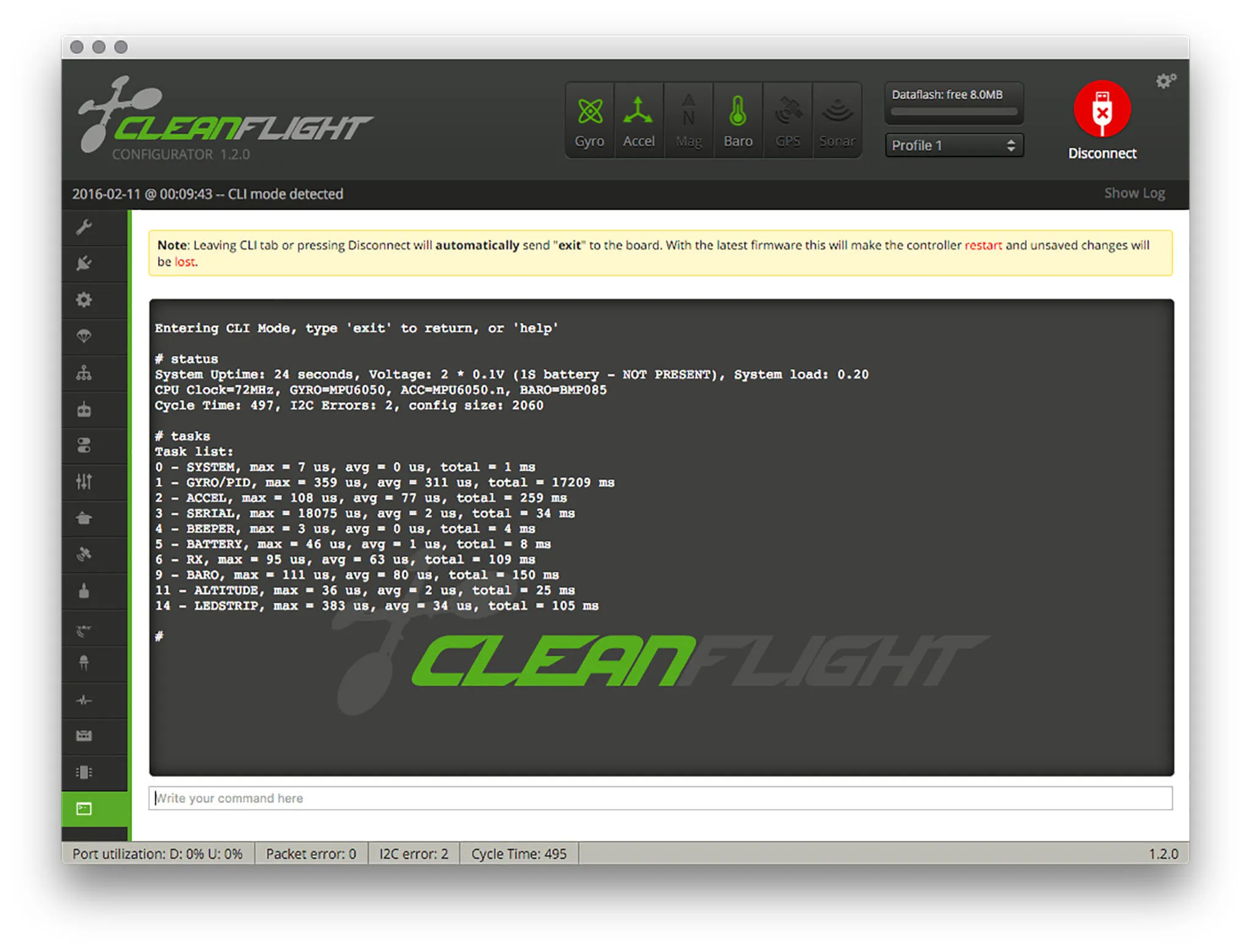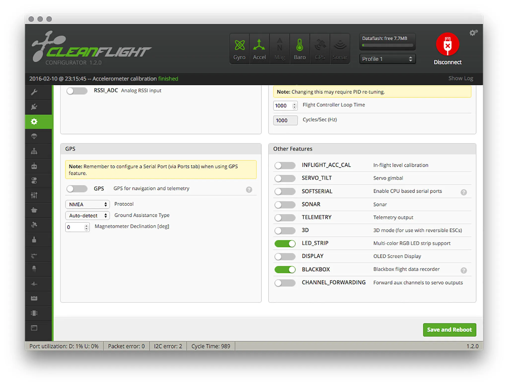 I bet you were wondering why we flashed BetaFlight instead of CleanFlight? Aside from the awesome stuff like filters and task scheduler, we can enable 2khz mode (500ms looptime), with: