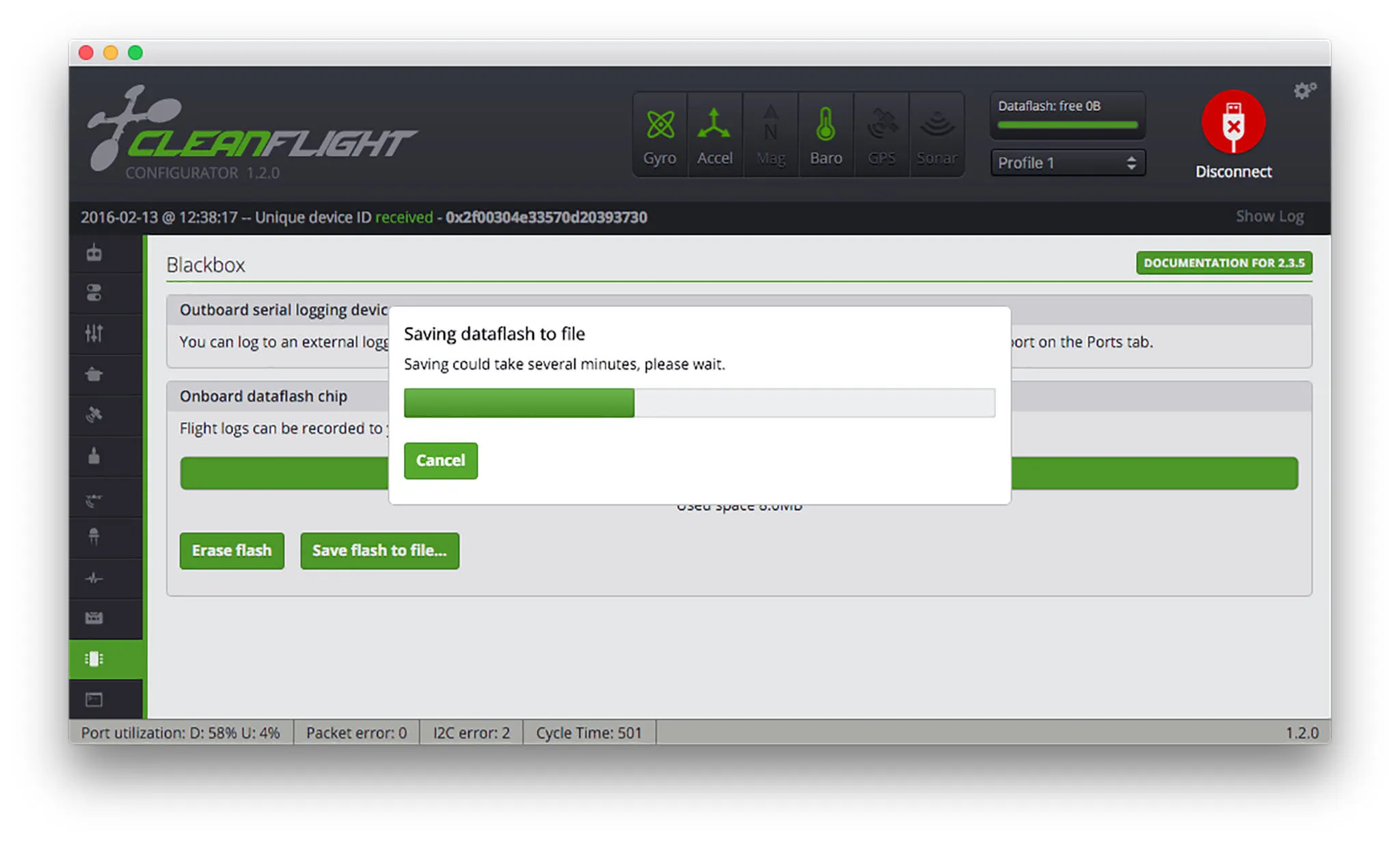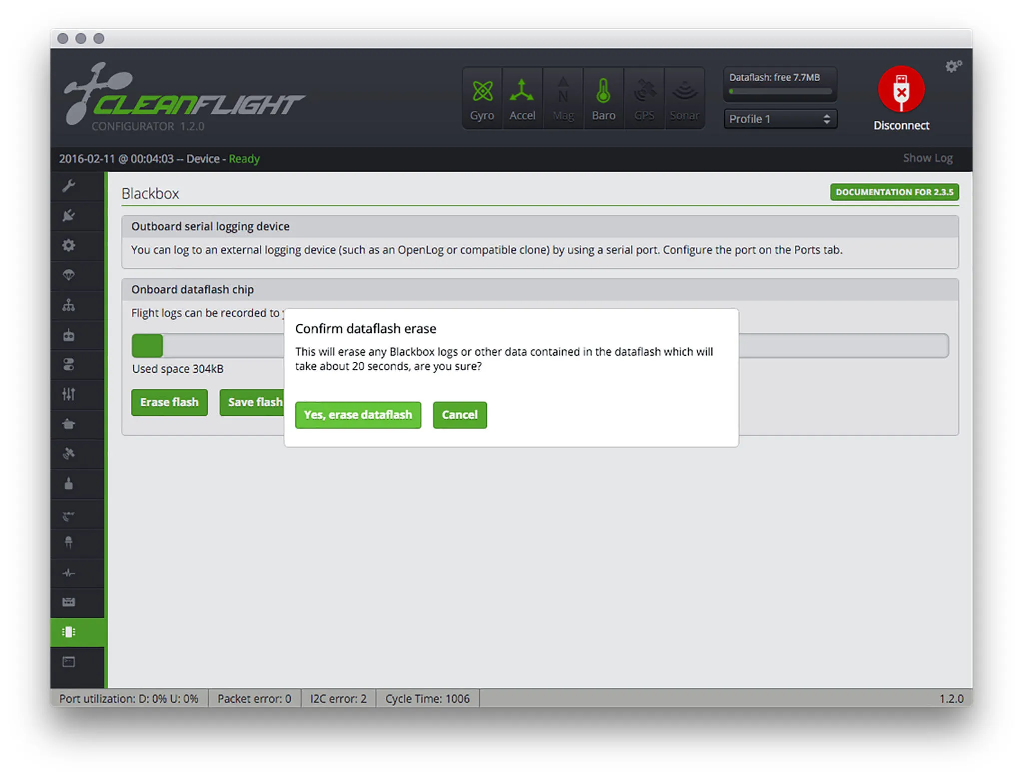 Check the blackbox tab. This is where you’ll go to download blackbox logs. If you have any data in use on the chip, you can go ahead and erase it now.