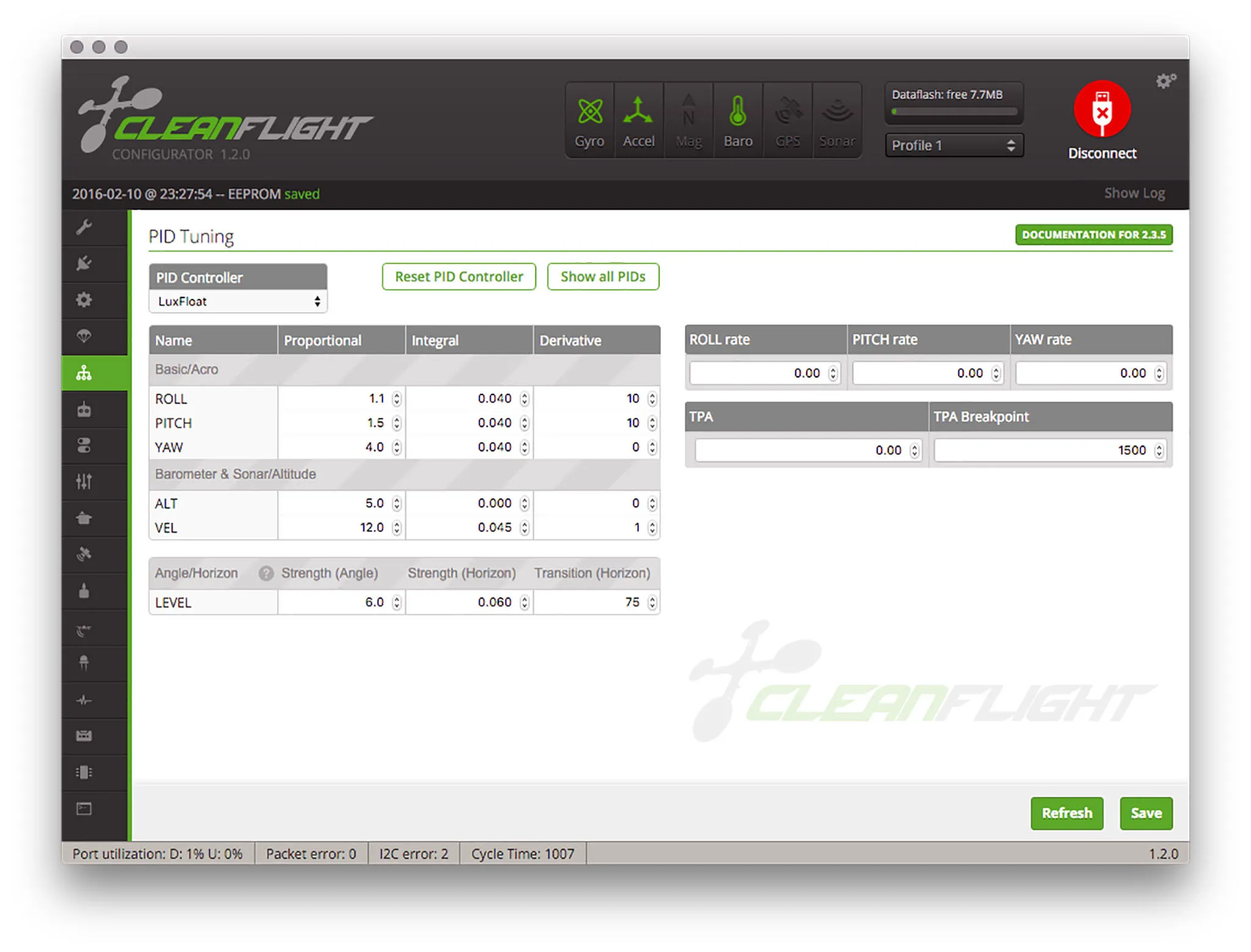 Mine had CleanFlight 1.11.0 on it, with what appear to be CleanFlight’s default PIDs.