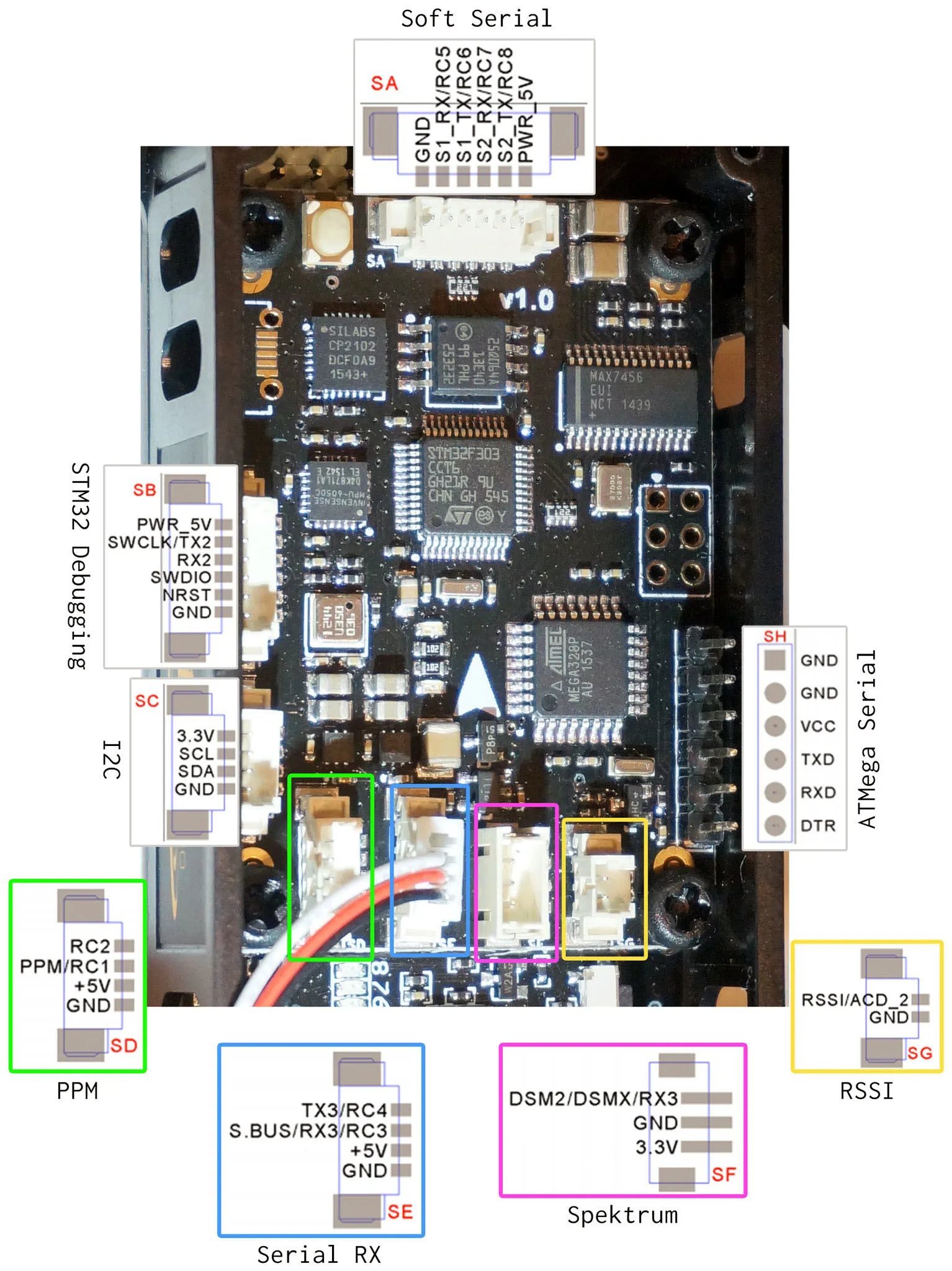 Note the S.BUS / PPM cable and RSSI cables are included. The Spektrum satellite port is a normal Spektrum plug, so if you’re using a Spektrum radio setup, you can plug that in without doing any soldering.