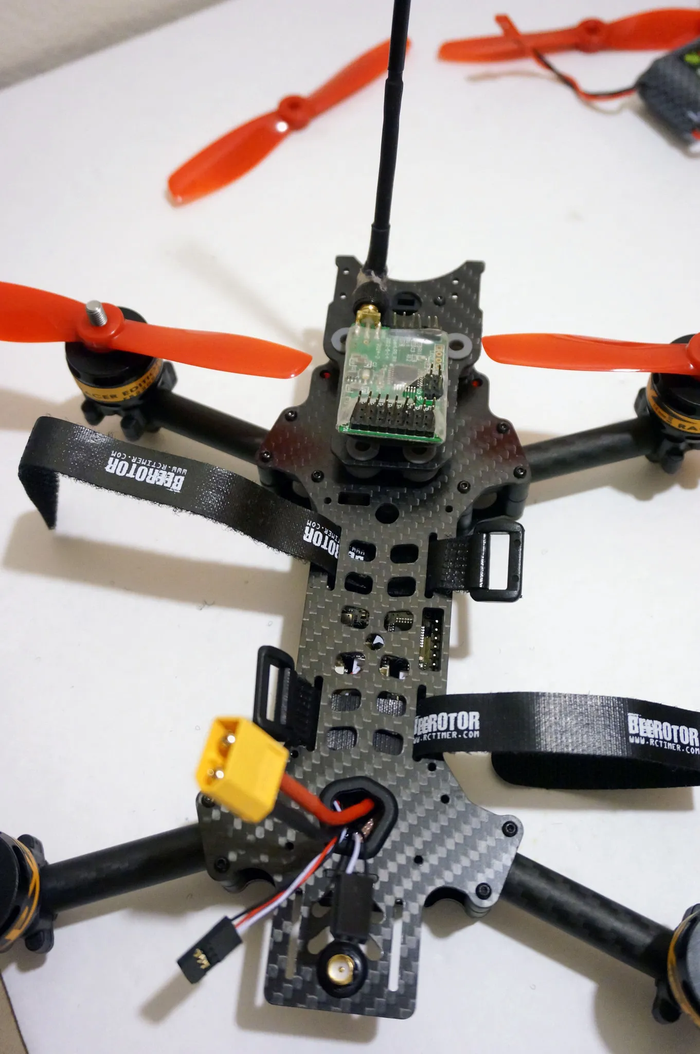 Since my XiaoMi Yi doesn’t fit upfront, at least with 5” props, that’s where I’ll put the receiver! With smaller props, my XiaoMi would fit up front, and I’d find a place for the RX in back.