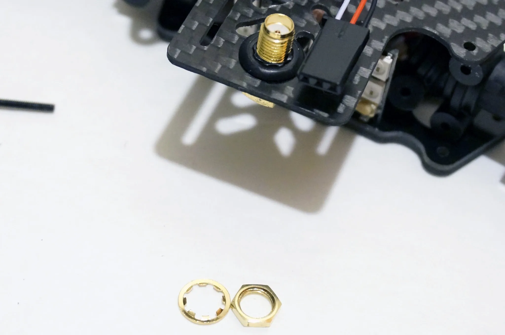 Also, make sure you securely tighten the gold SMA plug on the back. It’s bad news for your video transmitter if this plug comes un-screwed and your antenna doesn’t make full contact with the connector. Use the same socket wrench as you used to remove your props, 8mm, to tighten.