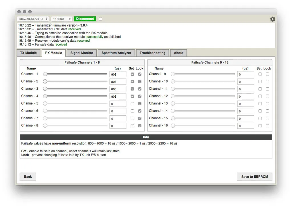 - So cleanflight knows that the link has failed, don’t wait too long though, we want the flight controller to know exactly when the link has failed. I’ve upped the timeout in Cleanflight to 3 seconds before we failsafe.