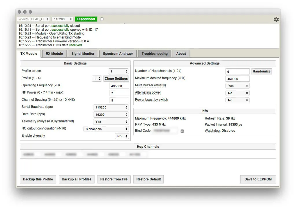 Defaults are mostly good. The only change I made was to set the max frequency to the top of the 70cm band: 450mhz, so we don’t accidentally use any frequencies outside of the band when channel hopping.