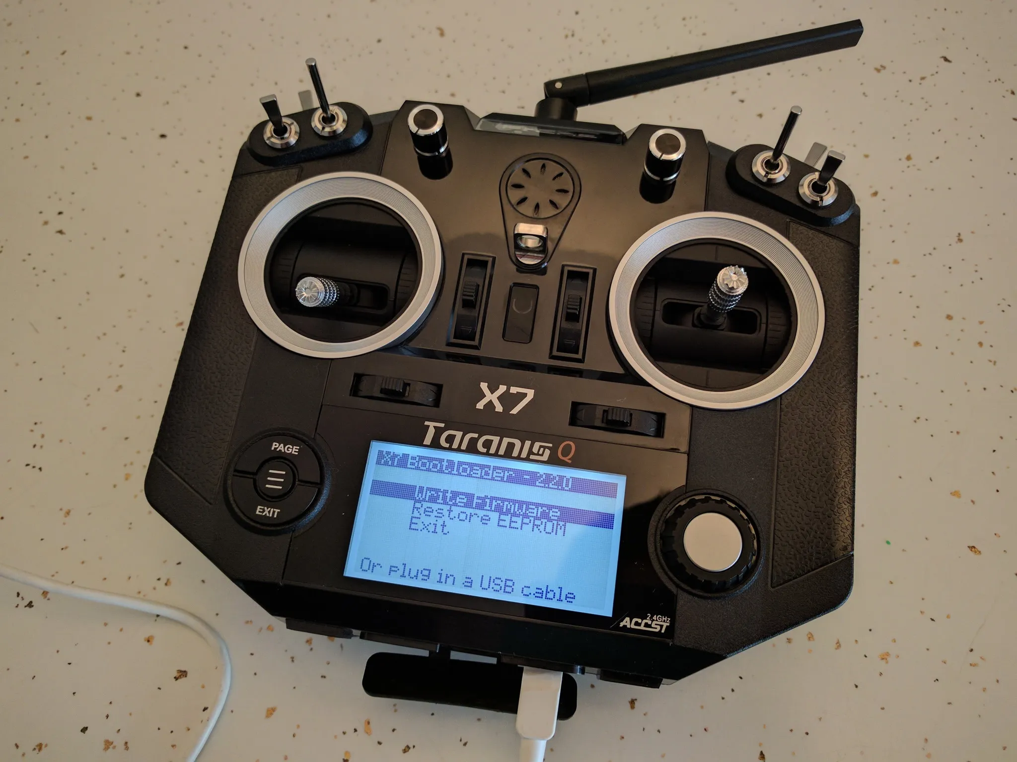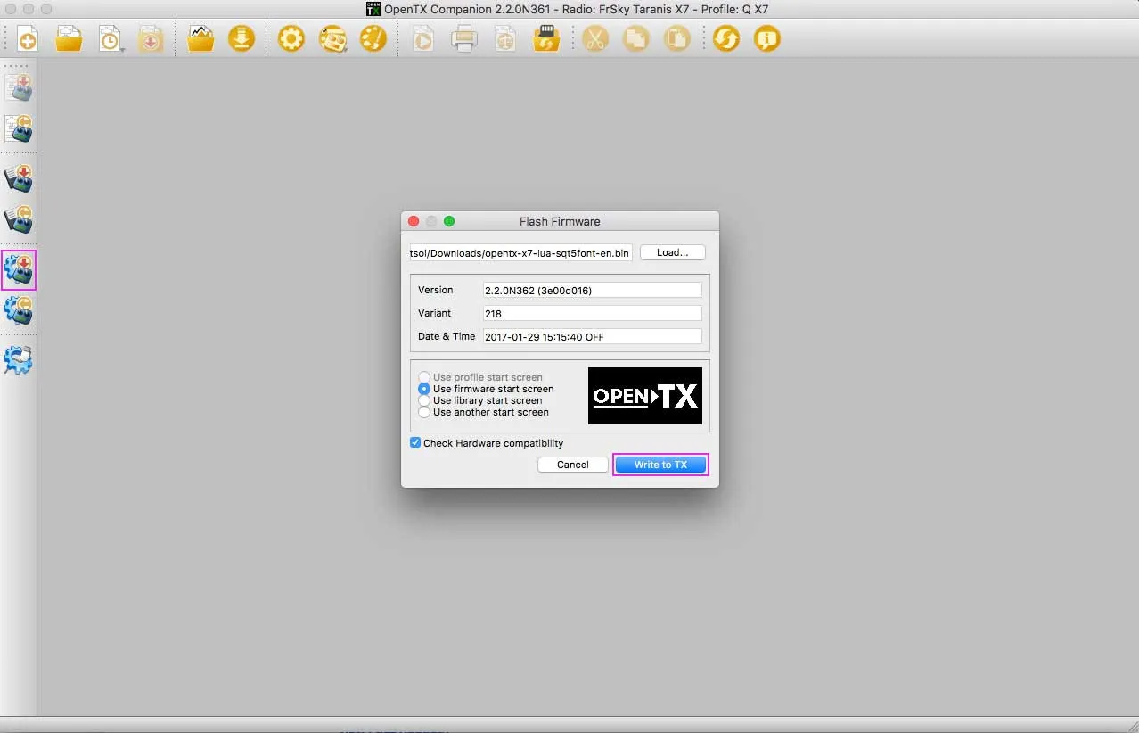 Plug in your radio via the USB cable. Click the flash firmware icon on the left and click “Write to TX”.