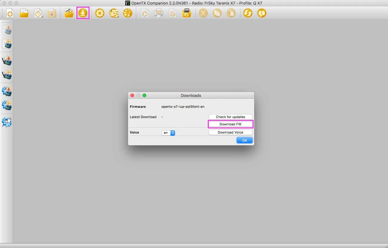 Close the application settings and open the download dialog. Click Download FW and hit OK.