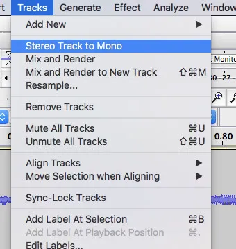 Once you’ve recorded the file, pick Tracks -> Stereo Track to Mono; otherwise, the audio playback will be really slow and distorted.