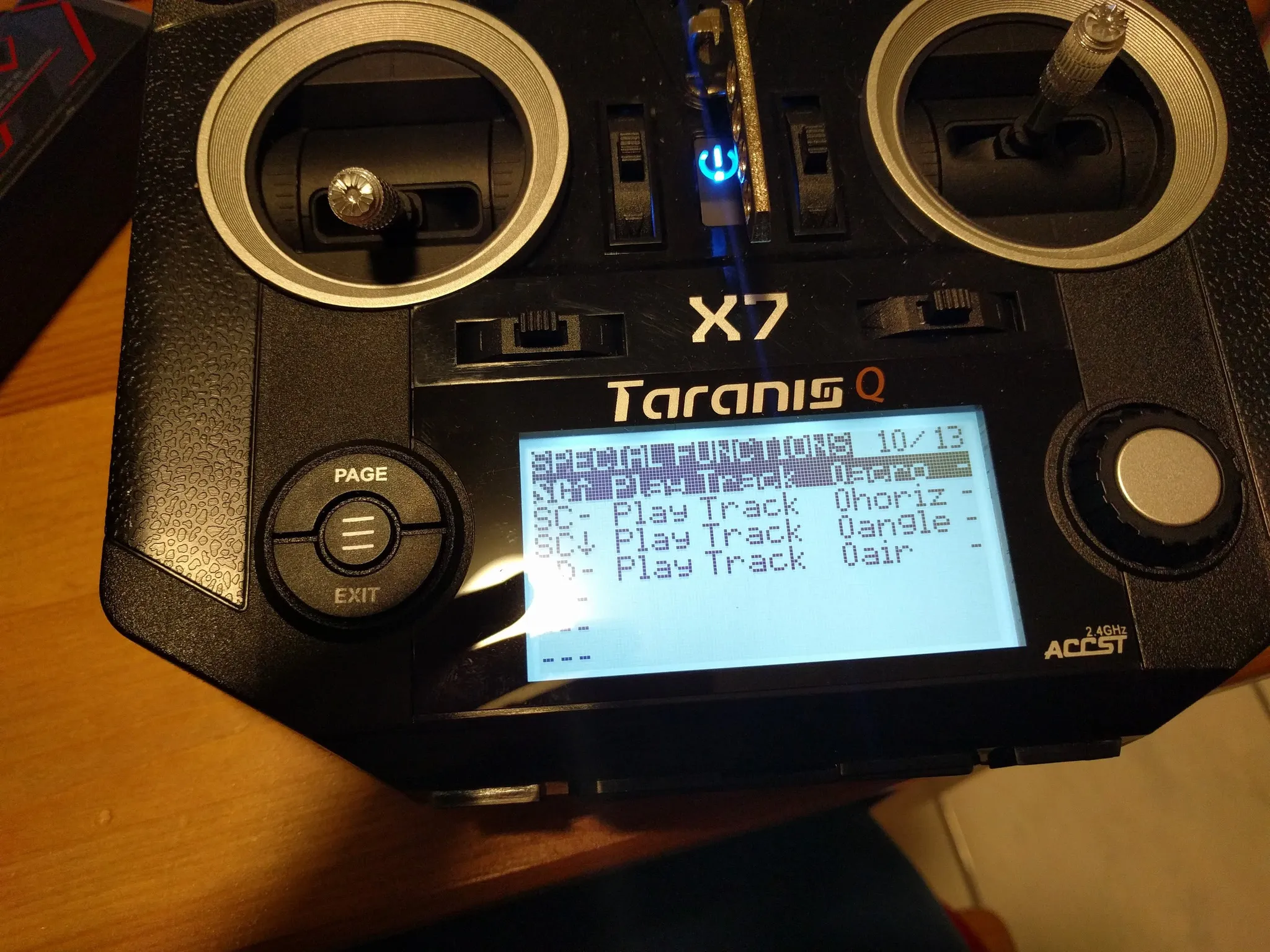 To play the file, open the model configuration (short press the hamburger button) and go to the special functions page. Add a row and flip the switch you want to use, putting it into the position it will be in for a given mode, then choose the Play Track option and pick your WAV file.
