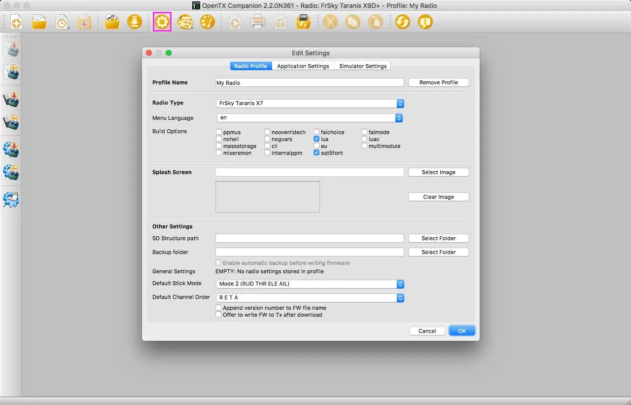 Open the OpenTX Companion, click the settings icon (gear) in the toolbar, and pick the x7 option from the radio type drop-down menu. I’ll also enable lua scripts and the sqt5font.