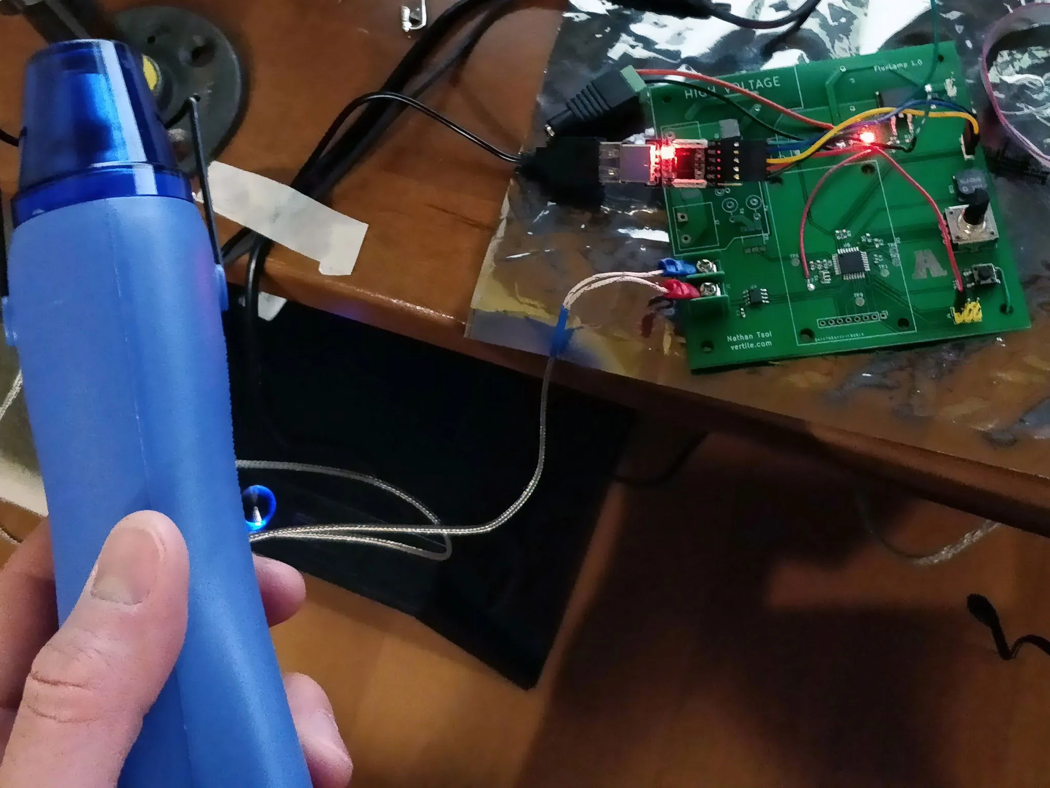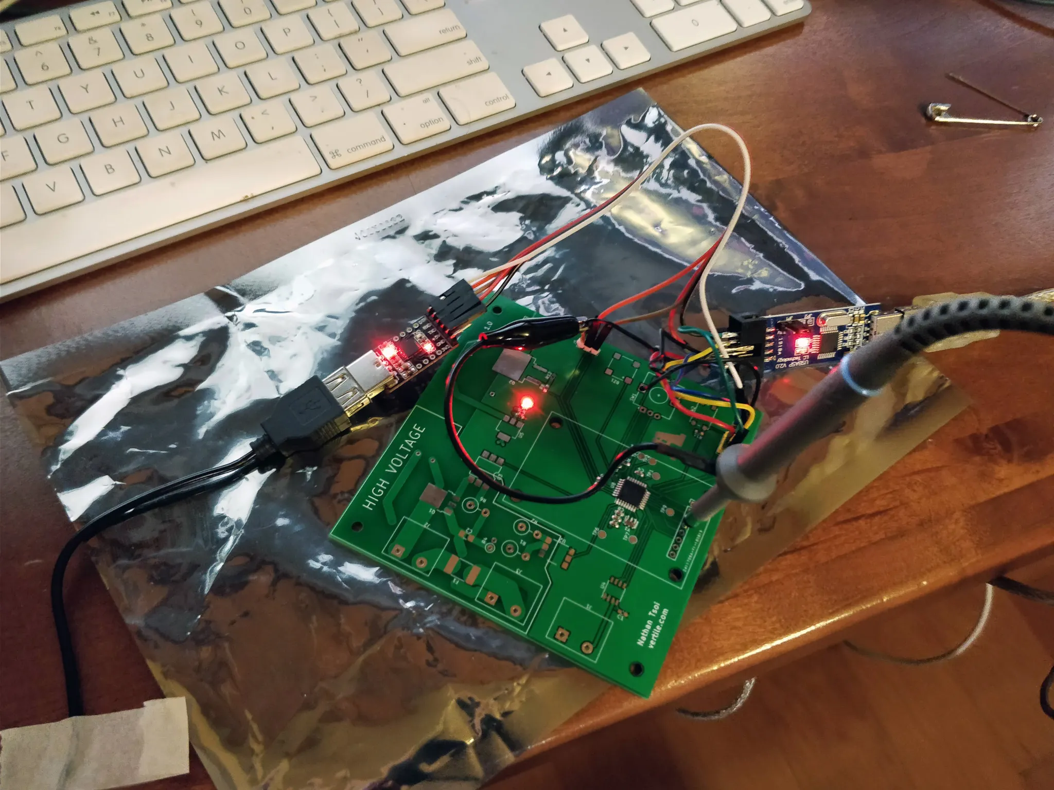 I tried to design the PowerCore PCB in one shot, without doing a dedicated development board first, since the design is relatively simple. Here’s a photo of the first revision. Here I’m testing the ATmega328p in isolation, to make sure it works before adding other components (trying to avoid the work of de-soldering to test individual subsystems later).