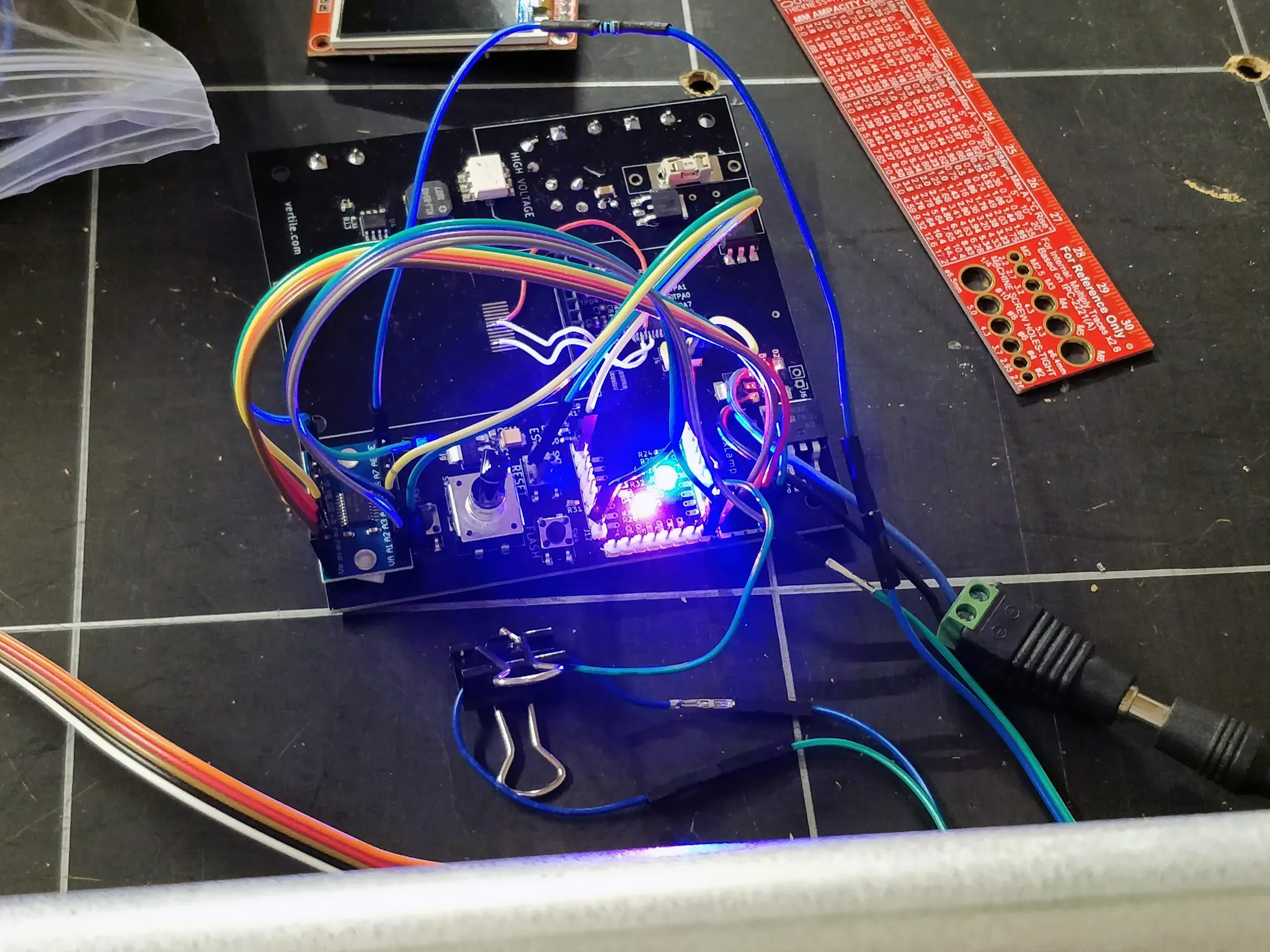 I slowly built up and tested each subsystem until the board was ready. You can see from the jumper wire, I wired a pin incorrectly. You can also see that I have 2 boards in the photo. Each has a different subsystems populated so that I can easily test and debug these subsystems independently. For the test, I wrote simple Arduino sketches that do things like buzz the buzzer, show a graphic on the LCD or read the rotary encoder.